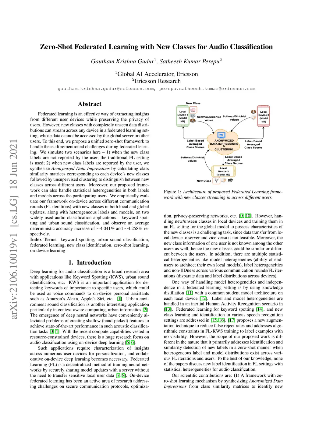 Federated learning is an effective way of extracting insights from different user devices while preserving the privacy of users. However, new classes with completely unseen data distributions can stream across any device in a federated learning setting, whose data cannot be accessed by the global server or other users. To this end, we propose a unified zero-shot framework to handle these aforementioned challenges during federated learning. We simulate two scenarios here -- 1) when the new class labels are not reported by the user, the traditional FL setting is used; 2) when new class labels are reported by the user, we synthesize Anonymized Data Impressions by calculating class similarity matrices corresponding to each device's new classes followed by unsupervised clustering to distinguish between new classes across different users. Moreover, our proposed framework can also handle statistical heterogeneities in both labels and models across the participating users. We empirically evaluate our framework on-device across different communication rounds (FL iterations) with new classes in both local and global updates, along with heterogeneous labels and models, on two widely used audio classification applications -- keyword spotting and urban sound classification, and observe an average deterministic accuracy increase of ~4.041% and ~4.258% respectively.