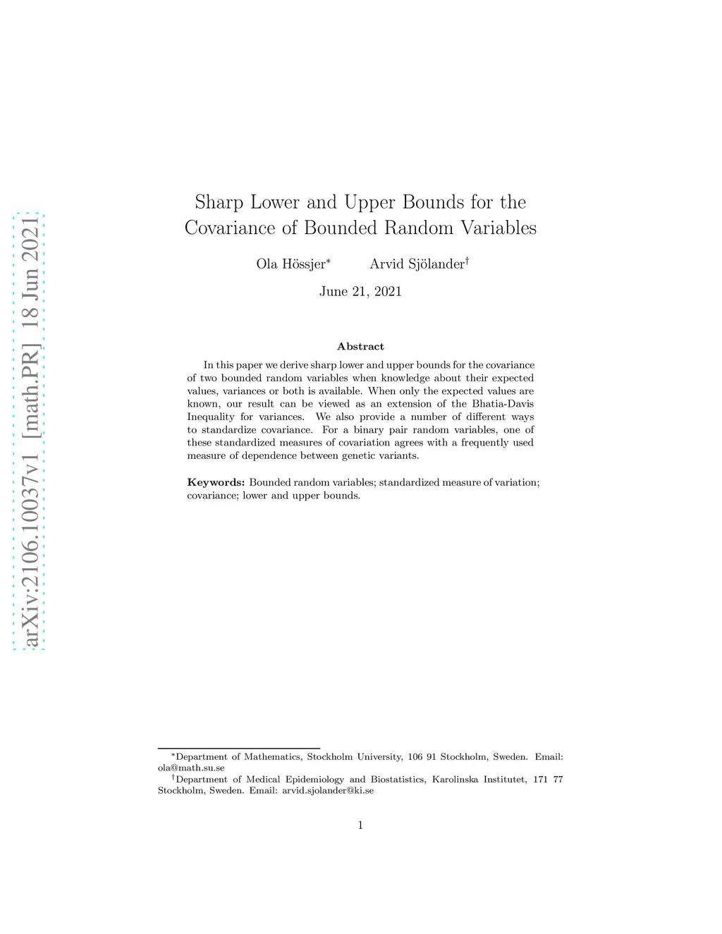 In this paper we derive sharp lower and upper bounds for the covariance of two bounded random variables when knowledge about their expected values, variances or both is available. When only the expected values are known, our result can be viewed as an extension of the Bhatia-Davis Inequality for variances. We also provide a number of different ways to standardize covariance. For a binary pair random variables, one of these standardized measures of covariation agrees with a frequently used measure of dependence between genetic variants.