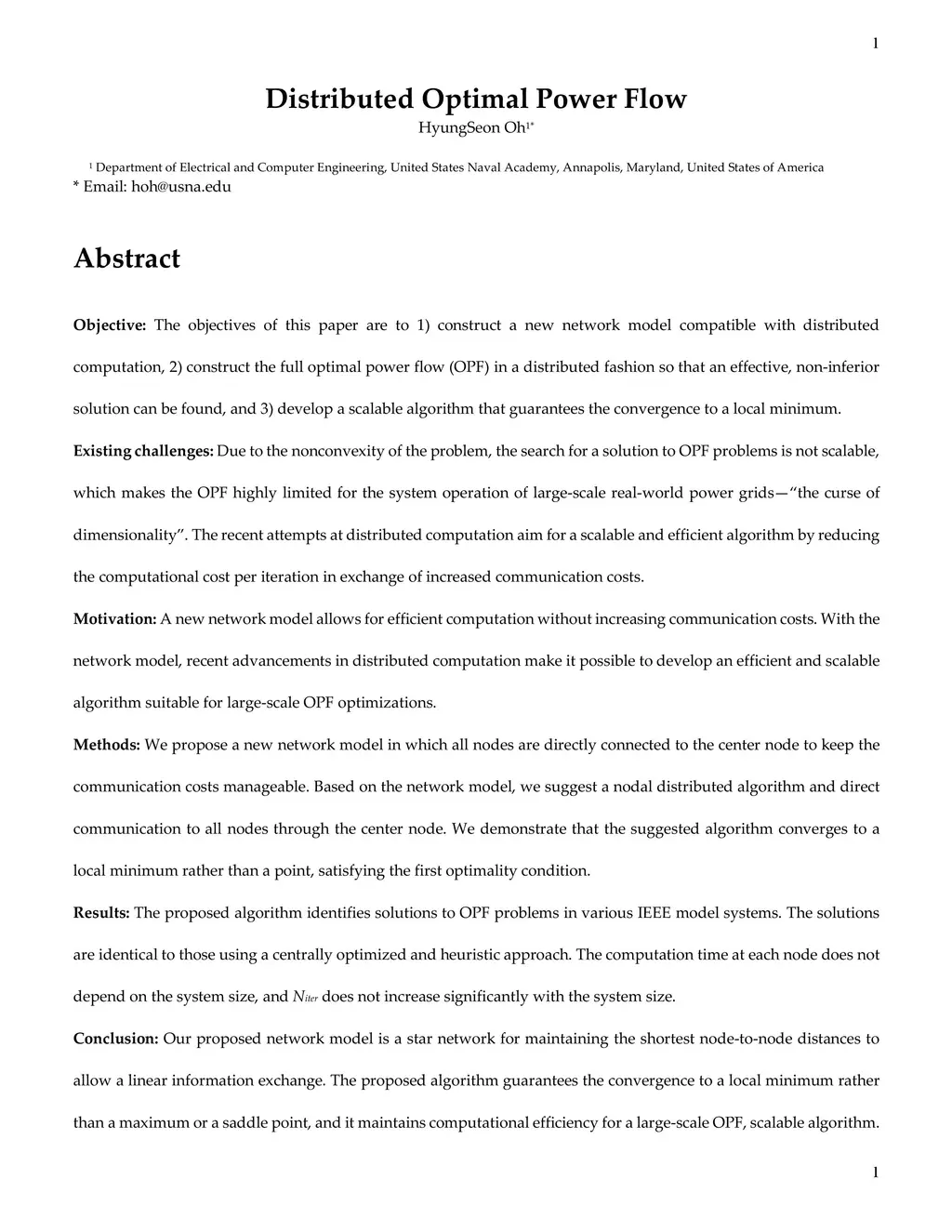 Abstract Objective: The objectives of this paper are to 1) construct a new network model compatible with distributed computation, 2) construct the full optimal power flow (OPF) in a distributed fashion so that an effective, non-inferior solution can be found, and 3) develop a scalable algorithm that guarantees the convergence to a local minimum.