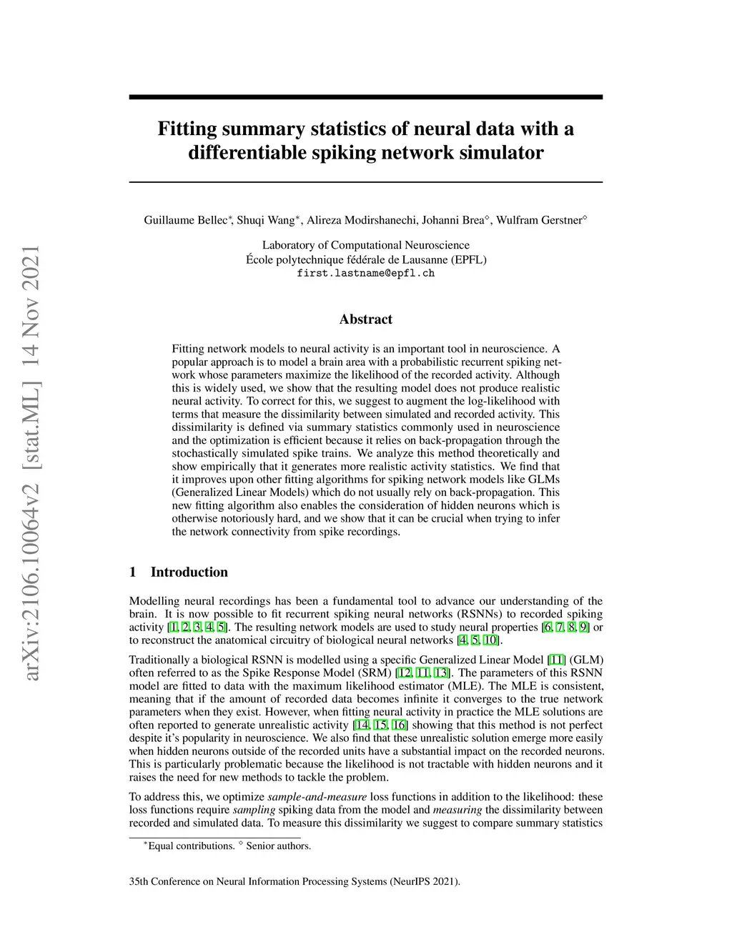 Fitting network models to neural activity is an important tool in neuroscience. A popular approach is to model a brain area with a probabilistic recurrent spiking network whose parameters maximize the likelihood of the recorded activity. Although this is widely used, we show that the resulting model does not produce realistic neural activity. To correct for this, we suggest to augment the log-likelihood with terms that measure the dissimilarity between simulated and recorded activity. This dissimilarity is defined via summary statistics commonly used in neuroscience and the optimization is efficient because it relies on back-propagation through the stochastically simulated spike trains. We analyze this method theoretically and show empirically that it generates more realistic activity statistics. We find that it improves upon other fitting algorithms for spiking network models like GLMs (Generalized Linear Models) which do not usually rely on back-propagation. This new fitting algorithm also enables the consideration of hidden neurons which is otherwise notoriously hard, and we show that it can be crucial when trying to infer the network connectivity from spike recordings.