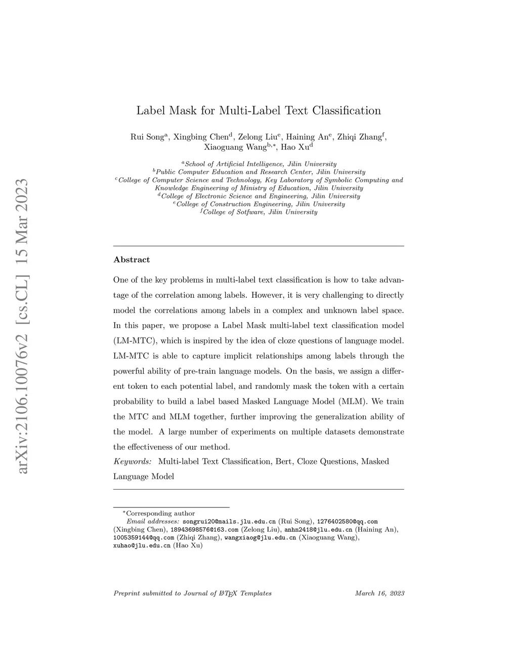 One of the key problems in multi-label text classification is how to take advantage of the correlation among labels. However, it is very challenging to directly model the correlations among labels in a complex and unknown label space. In this paper, we propose a Label Mask multi-label text classification model (LM-MTC), which is inspired by the idea of cloze questions of language model. LM-MTC is able to capture implicit relationships among labels through the powerful ability of pre-train language models. On the basis, we assign a different token to each potential label, and randomly mask the token with a certain probability to build a label based Masked Language Model (MLM). We train the MTC and MLM together, further improving the generalization ability of the model. A large number of experiments on multiple datasets demonstrate the effectiveness of our method.