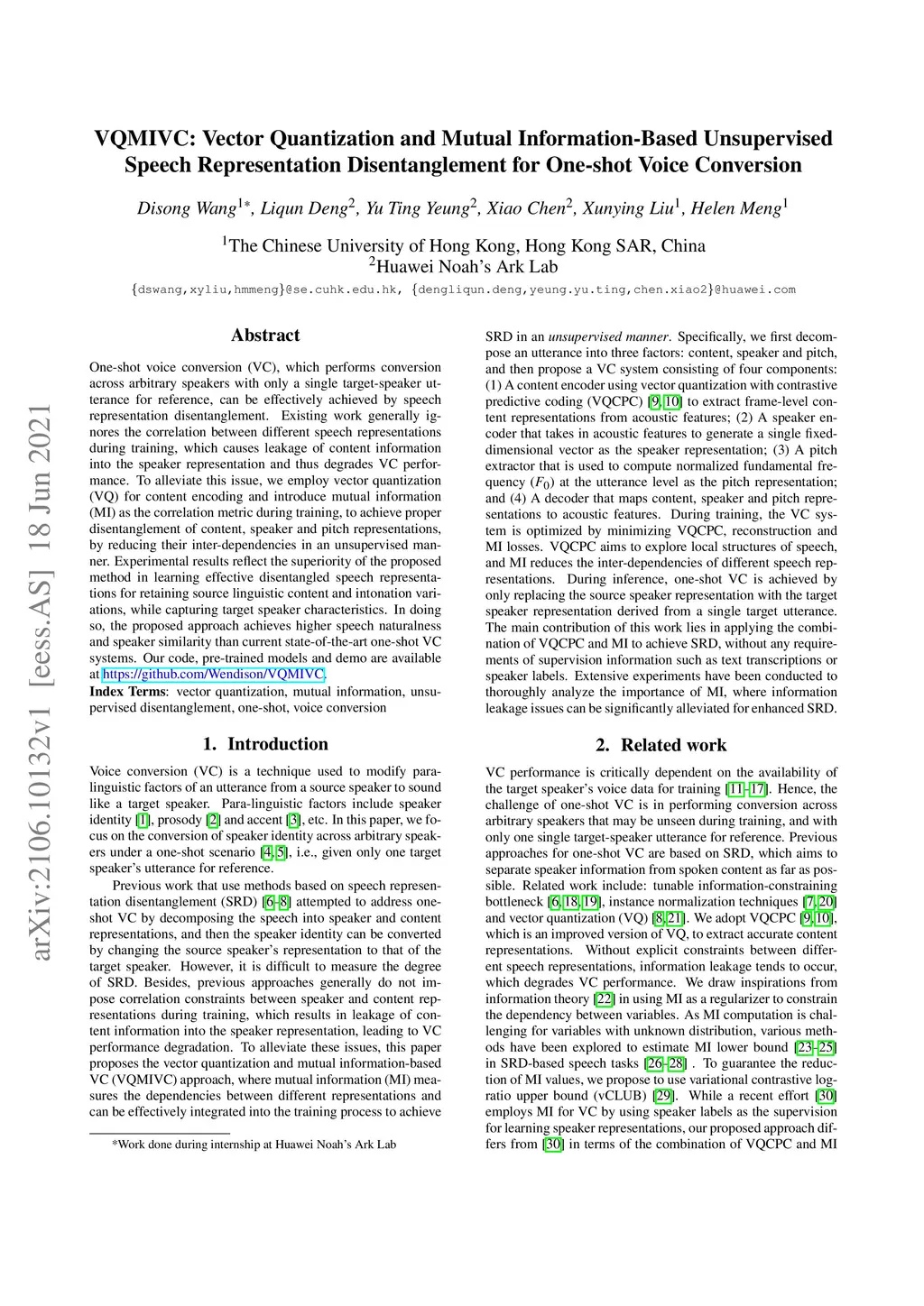 One-shot voice conversion (VC), which performs conversion across arbitrary speakers with only a single target-speaker utterance for reference, can be effectively achieved by speech representation disentanglement. Existing work generally ignores the correlation between different speech representations during training, which causes leakage of content information into the speaker representation and thus degrades VC performance. To alleviate this issue, we employ vector quantization (VQ) for content encoding and introduce mutual information (MI) as the correlation metric during training, to achieve proper disentanglement of content, speaker and pitch representations, by reducing their inter-dependencies in an unsupervised manner. Experimental results reflect the superiority of the proposed method in learning effective disentangled speech representations for retaining source linguistic content and intonation variations, while capturing target speaker characteristics. In doing so, the proposed approach achieves higher speech naturalness and speaker similarity than current state-of-the-art one-shot VC systems. Our code, pre-trained models and demo are available at https://github.com/Wendison/VQMIVC.