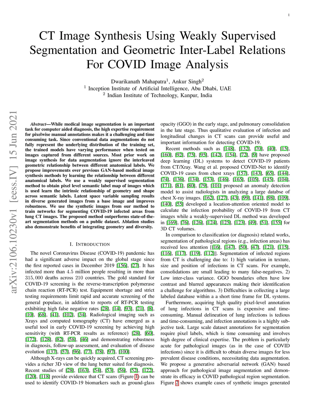 While medical image segmentation is an important task for computer aided diagnosis, the high expertise requirement for pixelwise manual annotations makes it a challenging and time consuming task. Since conventional data augmentations do not fully represent the underlying distribution of the training set, the trained models have varying performance when tested on images captured from different sources. Most prior work on image synthesis for data augmentation ignore the interleaved geometric relationship between different anatomical labels. We propose improvements over previous GAN-based medical image synthesis methods by learning the relationship between different anatomical labels. We use a weakly supervised segmentation method to obtain pixel level semantic label map of images which is used learn the intrinsic relationship of geometry and shape across semantic labels. Latent space variable sampling results in diverse generated images from a base image and improves robustness. We use the synthetic images from our method to train networks for segmenting COVID-19 infected areas from lung CT images. The proposed method outperforms state-of-the-art segmentation methods on a public dataset. Ablation studies also demonstrate benefits of integrating geometry and diversity.
