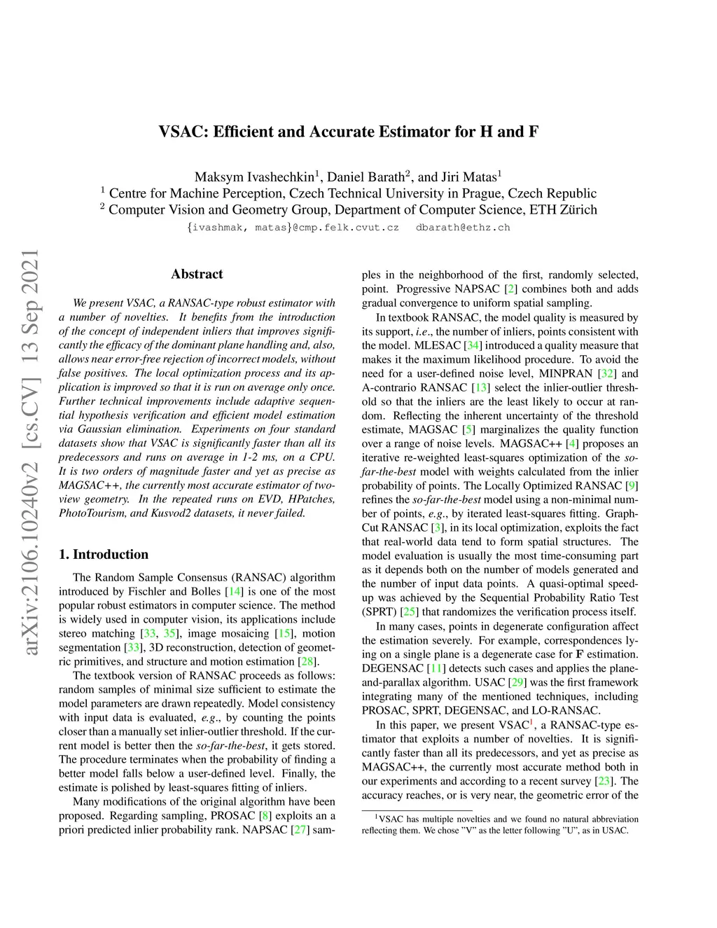 We present VSAC, a RANSAC-type robust estimator with a number of novelties. It benefits from the introduction of the concept of independent inliers that improves significantly the efficacy of the dominant plane handling and, also, allows near error-free rejection of incorrect models, without false positives. The local optimization process and its application is improved so that it is run on average only once. Further technical improvements include adaptive sequential hypothesis verification and efficient model estimation via Gaussian elimination. Experiments on four standard datasets show that VSAC is significantly faster than all its predecessors and runs on average in 1-2 ms, on a CPU. It is two orders of magnitude faster and yet as precise as MAGSAC++, the currently most accurate estimator of two-view geometry. In the repeated runs on EVD, HPatches, PhotoTourism, and Kusvod2 datasets, it never failed.