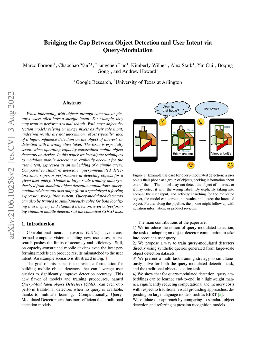 When interacting with objects through cameras, or pictures, users often have a specific intent. For example, they may want to perform a visual search. With most object detection models relying on image pixels as their sole input, undesired results are not uncommon. Most typically: lack of a high-confidence detection on the object of interest, or detection with a wrong class label. The issue is especially severe when operating capacity-constrained mobile object detectors on-device. In this paper we investigate techniques to modulate mobile detectors to explicitly account for the user intent, expressed as an embedding of a simple query. Compared to standard detectors, query-modulated detectors show superior performance at detecting objects for a given user query. Thanks to large-scale training data synthesized from standard object detection annotations, query-modulated detectors also outperform a specialized referring expression recognition system. Query-modulated detectors can also be trained to simultaneously solve for both localizing a user query and standard detection, even outperforming standard mobile detectors at the canonical COCO task.