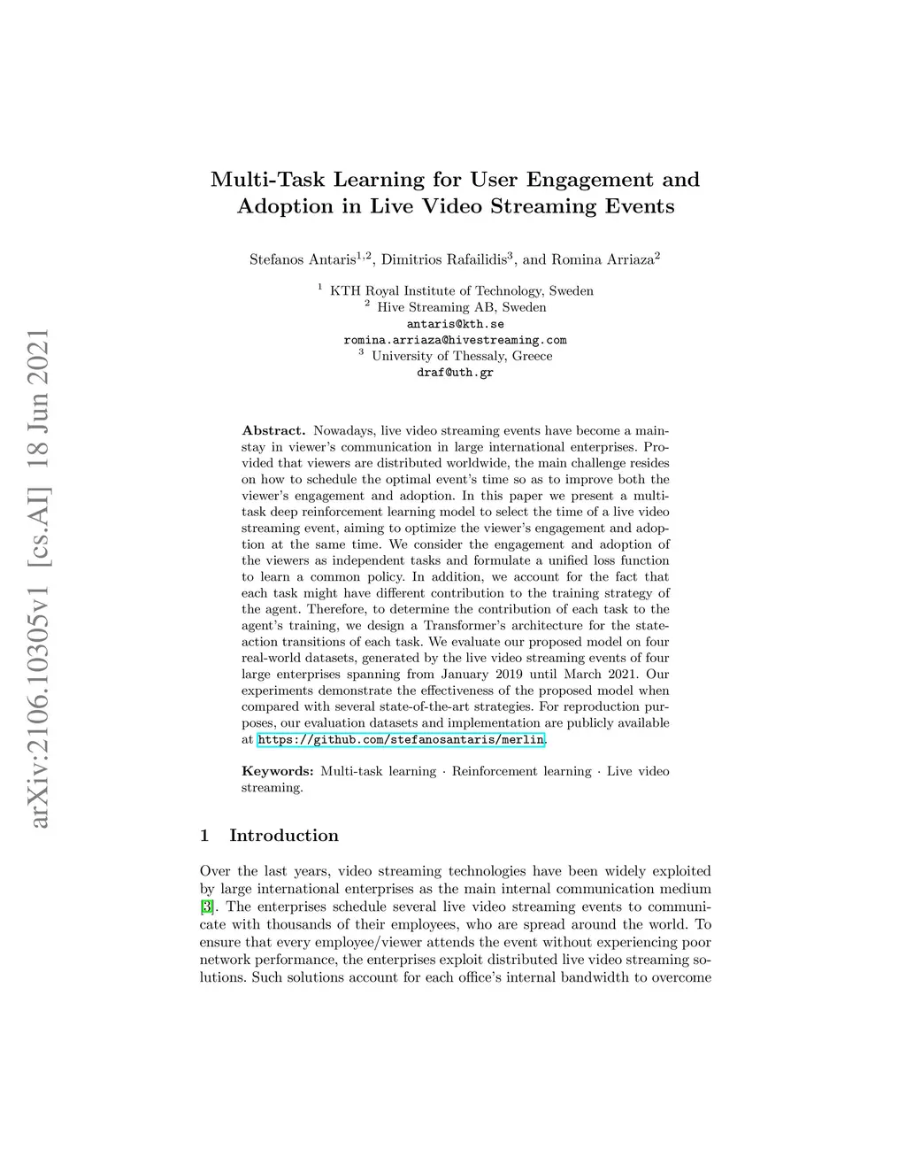 Nowadays, live video streaming events have become a mainstay in viewer's communication in large international enterprises. Provided that viewers are distributed worldwide, the main challenge resides on how to schedule the optimal event's time so as to improve both the viewer's engagement and adoption. In this paper we present a multi-task deep reinforcement learning model to select the time of a live video streaming event, aiming to optimize the viewer's engagement and adoption at the same time. We consider the engagement and adoption of the viewers as independent tasks and formulate a unified loss function to learn a common policy. In addition, we account for the fact that each task might have different contribution to the training strategy of the agent. Therefore, to determine the contribution of each task to the agent's training, we design a Transformer's architecture for the state-action transitions of each task. We evaluate our proposed model on four real-world datasets, generated by the live video streaming events of four large enterprises spanning from January 2019 until March 2021. Our experiments demonstrate the effectiveness of the proposed model when compared with several state-of-the-art strategies. For reproduction purposes, our evaluation datasets and implementation are publicly available at https://github.com/stefanosantaris/merlin.