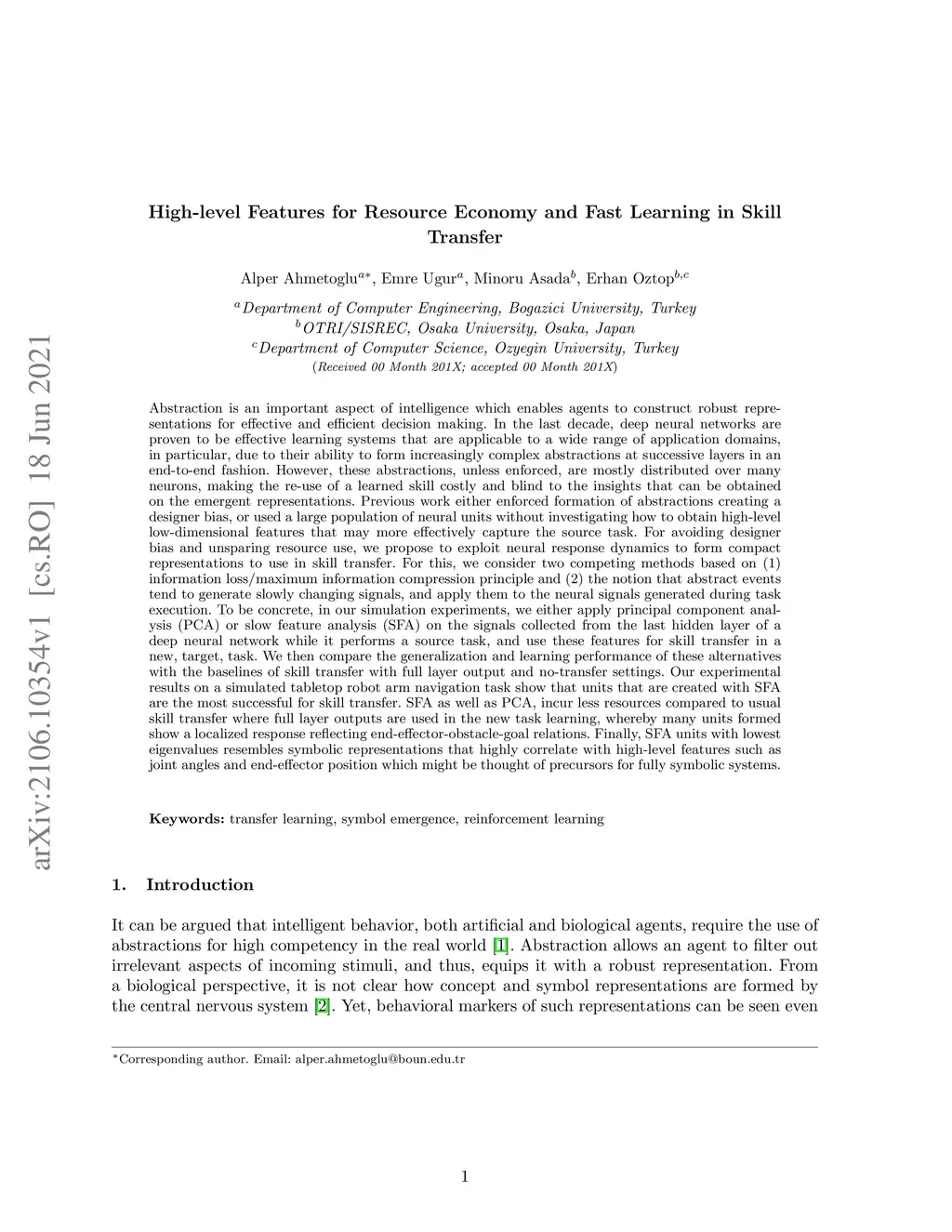 Abstraction is an important aspect of intelligence which enables agents to construct robust representations for effective decision making. In the last decade, deep networks are proven to be effective due to their ability to form increasingly complex abstractions. However, these abstractions are distributed over many neurons, making the re-use of a learned skill costly. Previous work either enforced formation of abstractions creating a designer bias, or used a large number of neural units without investigating how to obtain high-level features that may more effectively capture the source task. For avoiding designer bias and unsparing resource use, we propose to exploit neural response dynamics to form compact representations to use in skill transfer. For this, we consider two competing methods based on (1) maximum information compression principle and (2) the notion that abstract events tend to generate slowly changing signals, and apply them to the neural signals generated during task execution. To be concrete, in our simulation experiments, we either apply principal component analysis (PCA) or slow feature analysis (SFA) on the signals collected from the last hidden layer of a deep network while it performs a source task, and use these features for skill transfer in a new target task. We compare the generalization performance of these alternatives with the baselines of skill transfer with full layer output and no-transfer settings. Our results show that SFA units are the most successful for skill transfer. SFA as well as PCA, incur less resources compared to usual skill transfer, whereby many units formed show a localized response reflecting end-effector-obstacle-goal relations. Finally, SFA units with lowest eigenvalues resembles symbolic representations that highly correlate with high-level features such as joint angles which might be thought of precursors for fully symbolic systems.