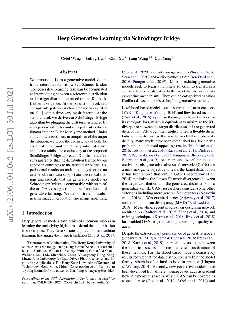 We propose to learn a generative model via entropy interpolation with a Schr\"{o}dinger Bridge. The generative learning task can be formulated as interpolating between a reference distribution and a target distribution based on the Kullback-Leibler divergence. At the population level, this entropy interpolation is characterized via an SDE on with a time-varying drift term. At the sample level, we derive our Schr\"{o}dinger Bridge algorithm by plugging the drift term estimated by a deep score estimator and a deep density ratio estimator into the Euler-Maruyama method. Under some mild smoothness assumptions of the target distribution, we prove the consistency of both the score estimator and the density ratio estimator, and then establish the consistency of the proposed Schr\"{o}dinger Bridge approach. Our theoretical results guarantee that the distribution learned by our approach converges to the target distribution. Experimental results on multimodal synthetic data and benchmark data support our theoretical findings and indicate that the generative model via Schr\"{o}dinger Bridge is comparable with state-of-the-art GANs, suggesting a new formulation of generative learning. We demonstrate its usefulness in image interpolation and image inpainting.