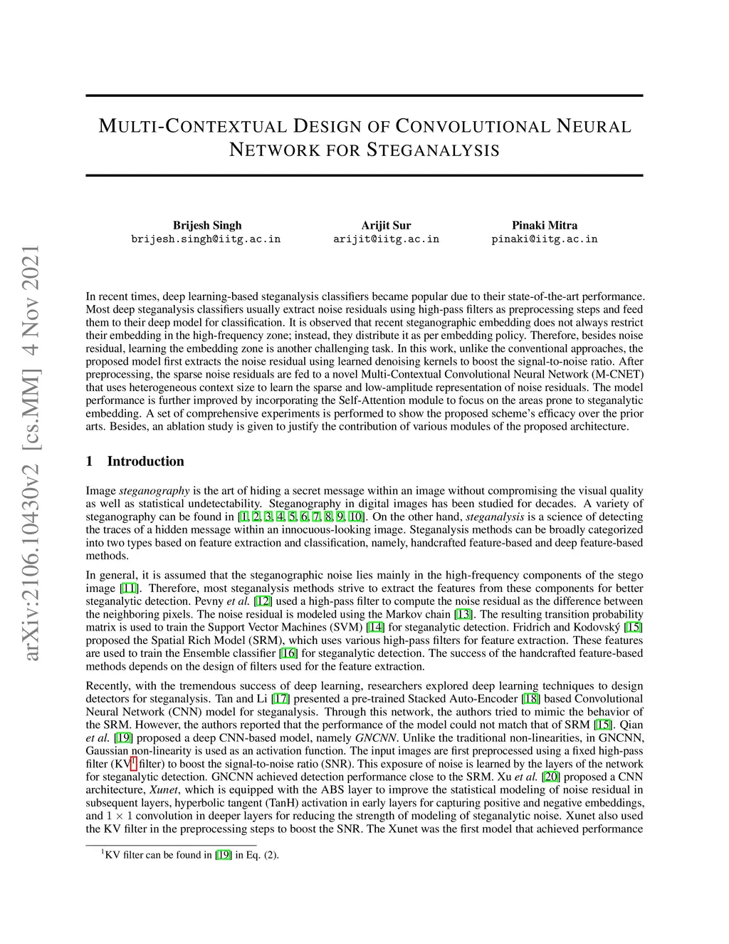 In recent times, deep learning-based steganalysis classifiers became popular due to their state-of-the-art performance. Most deep steganalysis classifiers usually extract noise residuals using high-pass filters as preprocessing steps and feed them to their deep model for classification. It is observed that recent steganographic embedding does not always restrict their embedding in the high-frequency zone; instead, they distribute it as per embedding policy. Therefore, besides noise residual, learning the embedding zone is another challenging task. In this work, unlike the conventional approaches, the proposed model first extracts the noise residual using learned denoising kernels to boost the signal-to-noise ratio. After preprocessing, the sparse noise residuals are fed to a novel Multi-Contextual Convolutional Neural Network (M-CNET) that uses heterogeneous context size to learn the sparse and low-amplitude representation of noise residuals. The model performance is further improved by incorporating the Self-Attention module to focus on the areas prone to steganalytic embedding. A set of comprehensive experiments is performed to show the proposed scheme's efficacy over the prior arts. Besides, an ablation study is given to justify the contribution of various modules of the proposed architecture.