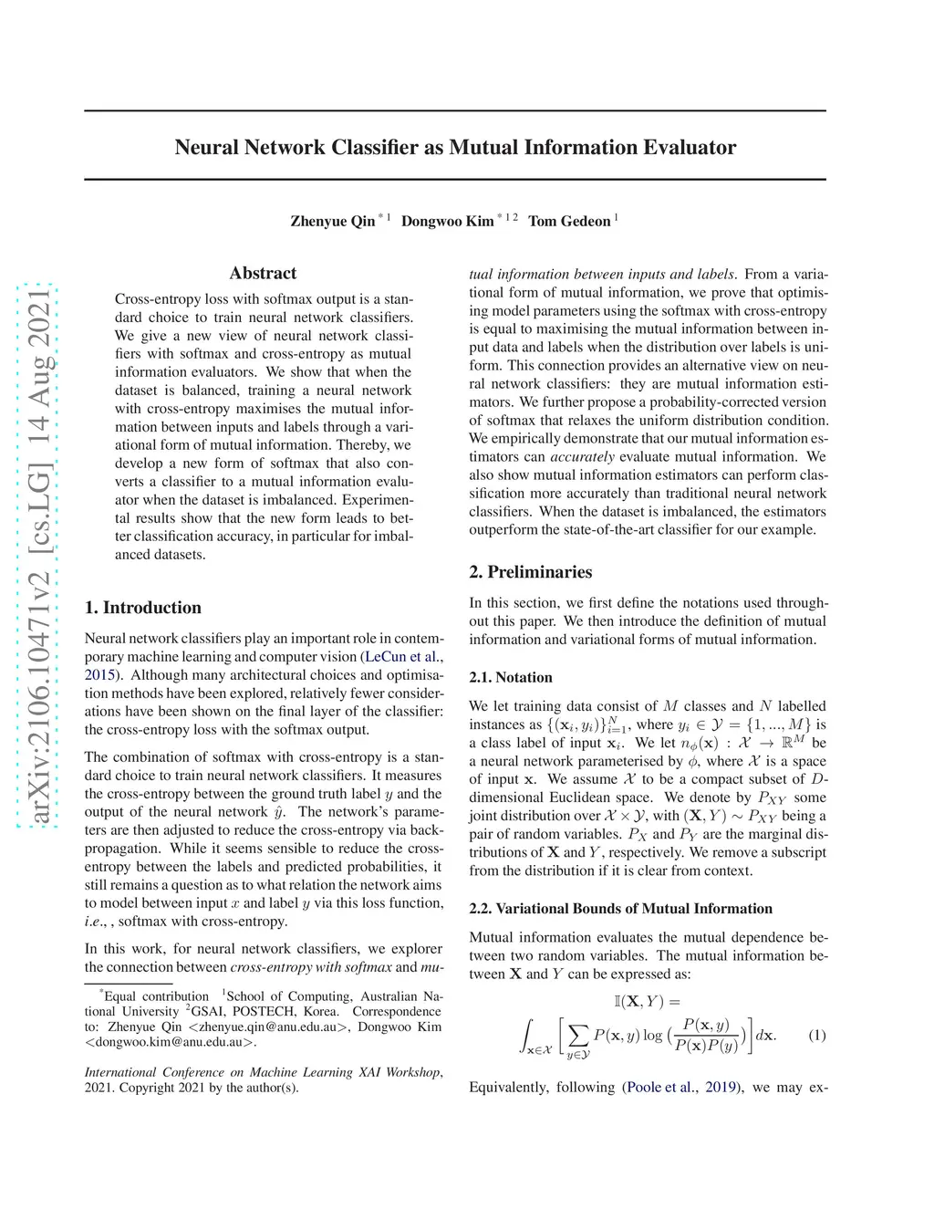 Cross-entropy loss with softmax output is a standard choice to train neural network classifiers. We give a new view of neural network classifiers with softmax and cross-entropy as mutual information evaluators. We show that when the dataset is balanced, training a neural network with cross-entropy maximises the mutual information between inputs and labels through a variational form of mutual information. Thereby, we develop a new form of softmax that also converts a classifier to a mutual information evaluator when the dataset is imbalanced. Experimental results show that the new form leads to better classification accuracy, in particular for imbalanced datasets.
