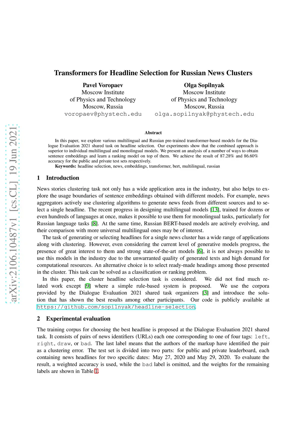 In this paper, we explore various multilingual and Russian pre-trained transformer-based models for the Dialogue Evaluation 2021 shared task on headline selection. Our experiments show that the combined approach is superior to individual multilingual and monolingual models. We present an analysis of a number of ways to obtain sentence embeddings and learn a ranking model on top of them. We achieve the result of 87.28% and 86.60% accuracy for the public and private test sets respectively.
