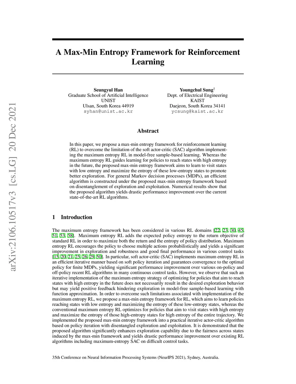 In this paper, we propose a max-min entropy framework for reinforcement learning (RL) to overcome the limitation of the soft actor-critic (SAC) algorithm implementing the maximum entropy RL in model-free sample-based learning. Whereas the maximum entropy RL guides learning for policies to reach states with high entropy in the future, the proposed max-min entropy framework aims to learn to visit states with low entropy and maximize the entropy of these low-entropy states to promote better exploration. For general Markov decision processes (MDPs), an efficient algorithm is constructed under the proposed max-min entropy framework based on disentanglement of exploration and exploitation. Numerical results show that the proposed algorithm yields drastic performance improvement over the current state-of-the-art RL algorithms.