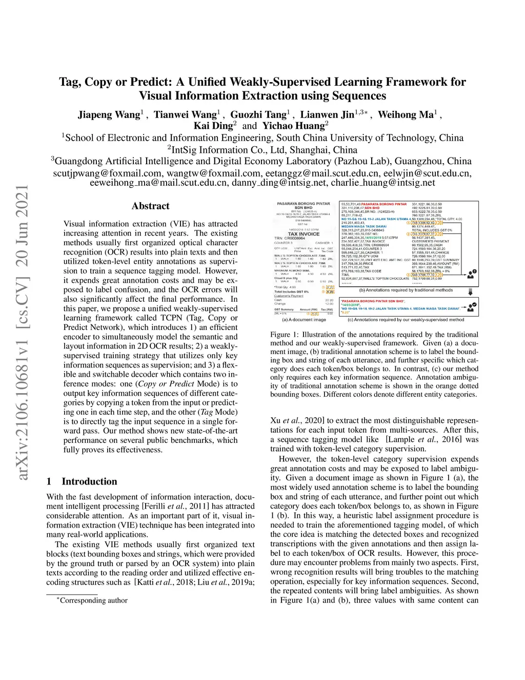Visual information extraction (VIE) has attracted increasing attention in recent years. The existing methods usually first organized optical character recognition (OCR) results into plain texts and then utilized token-level entity annotations as supervision to train a sequence tagging model. However, it expends great annotation costs and may be exposed to label confusion, and the OCR errors will also significantly affect the final performance. In this paper, we propose a unified weakly-supervised learning framework called TCPN (Tag, Copy or Predict Network), which introduces 1) an efficient encoder to simultaneously model the semantic and layout information in 2D OCR results; 2) a weakly-supervised training strategy that utilizes only key information sequences as supervision; and 3) a flexible and switchable decoder which contains two inference modes: one (Copy or Predict Mode) is to output key information sequences of different categories by copying a token from the input or predicting one in each time step, and the other (Tag Mode) is to directly tag the input sequence in a single forward pass. Our method shows new state-of-the-art performance on several public benchmarks, which fully proves its effectiveness.