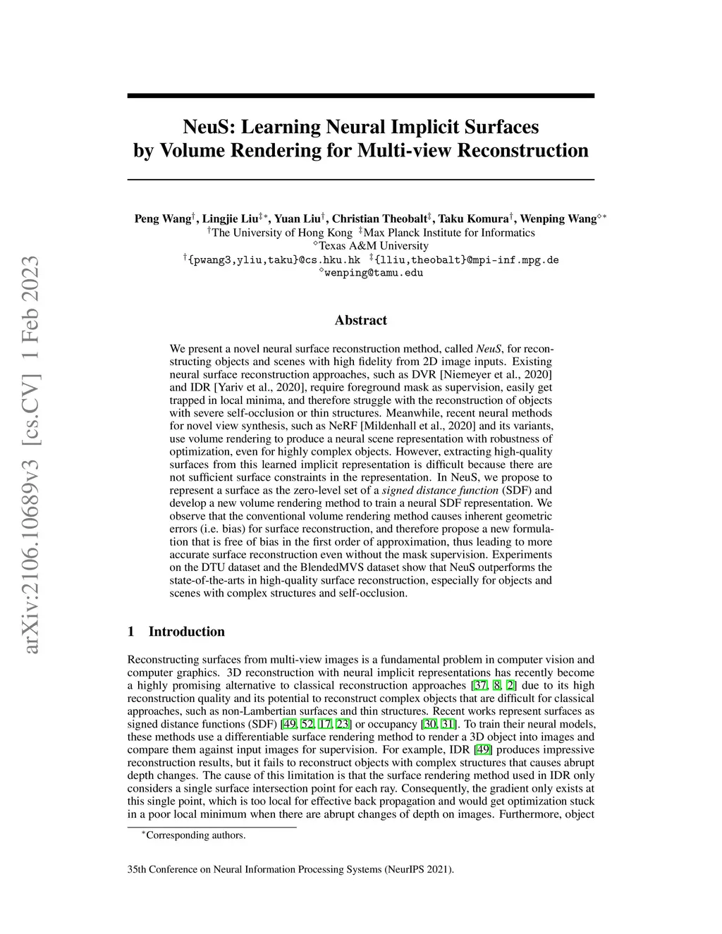 NeuS: Learning Neural Implicit Surfaces by Volume Rendering for