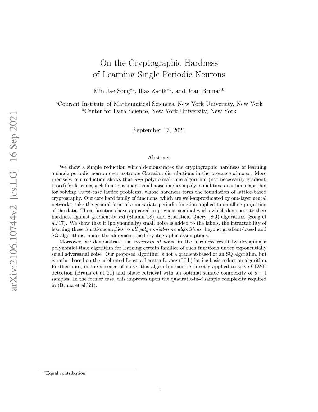 We show a simple reduction which demonstrates the cryptographic hardness of learning a single periodic neuron over isotropic Gaussian distributions in the presence of noise. More precisely, our reduction shows that any polynomial-time algorithm (not necessarily gradient-based) for learning such functions under small noise implies a polynomial-time quantum algorithm for solving worst-case lattice problems, whose hardness form the foundation of lattice-based cryptography. Our core hard family of functions, which are well-approximated by one-layer neural networks, take the general form of a univariate periodic function applied to an affine projection of the data. These functions have appeared in previous seminal works which demonstrate their hardness against gradient-based (Shamir'18), and Statistical Query (SQ) algorithms (Song et al.'17). We show that if (polynomially) small noise is added to the labels, the intractability of learning these functions applies to all polynomial-time algorithms, beyond gradient-based and SQ algorithms, under the aforementioned cryptographic assumptions. Moreover, we demonstrate the necessity of noise in the hardness result by designing a polynomial-time algorithm for learning certain families of such functions under exponentially small adversarial noise. Our proposed algorithm is not a gradient-based or an SQ algorithm, but is rather based on the celebrated Lenstra-Lenstra-Lov\ász (LLL) lattice basis reduction algorithm. Furthermore, in the absence of noise, this algorithm can be directly applied to solve CLWE detection (Bruna et al.'21) and phase retrieval with an optimal sample complexity of samples. In the former case, this improves upon the quadratic-in- sample complexity required in (Bruna et al.'21).