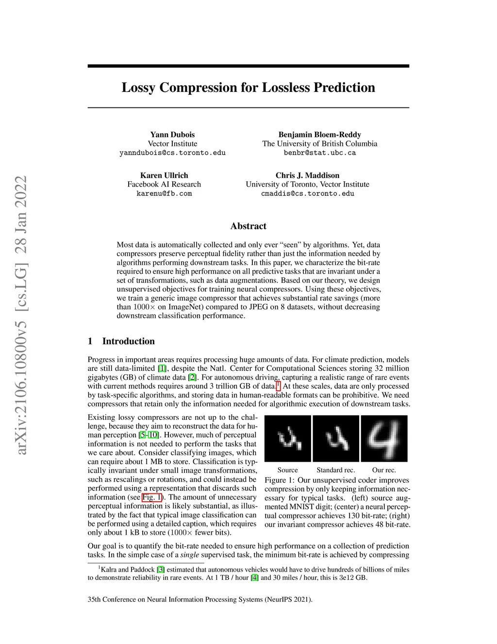 Most data is automatically collected and only ever "seen" by algorithms. Yet, data compressors preserve perceptual fidelity rather than just the information needed by algorithms performing downstream tasks. In this paper, we characterize the bit-rate required to ensure high performance on all predictive tasks that are invariant under a set of transformations, such as data augmentations. Based on our theory, we design unsupervised objectives for training neural compressors. Using these objectives, we train a generic image compressor that achieves substantial rate savings (more than 1000×1000\times on ImageNet) compared to JPEG on 8 datasets, without decreasing downstream classification performance.