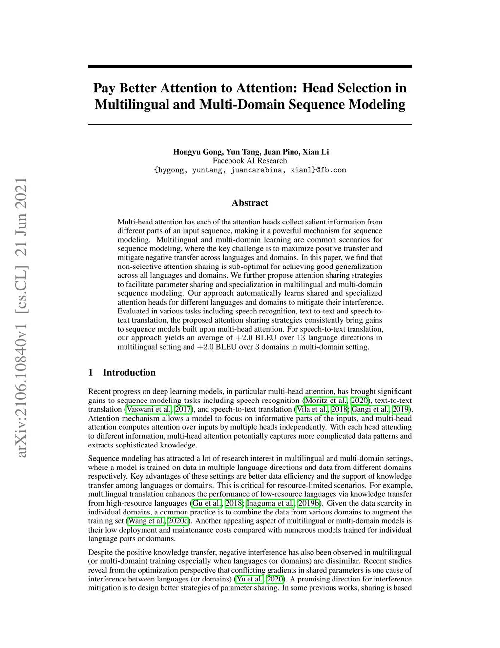 Multi-head attention has each of the attention heads collect salient information from different parts of an input sequence, making it a powerful mechanism for sequence modeling. Multilingual and multi-domain learning are common scenarios for sequence modeling, where the key challenge is to maximize positive transfer and mitigate negative transfer across languages and domains. In this paper, we find that non-selective attention sharing is sub-optimal for achieving good generalization across all languages and domains. We further propose attention sharing strategies to facilitate parameter sharing and specialization in multilingual and multi-domain sequence modeling. Our approach automatically learns shared and specialized attention heads for different languages and domains to mitigate their interference. Evaluated in various tasks including speech recognition, text-to-text and speech-to-text translation, the proposed attention sharing strategies consistently bring gains to sequence models built upon multi-head attention. For speech-to-text translation, our approach yields an average of BLEU over language directions in multilingual setting and BLEU over domains in multi-domain setting.