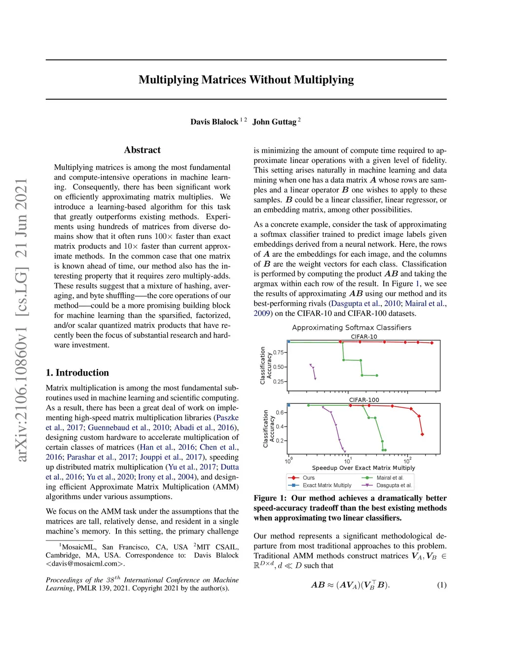Multiplying matrices is among the most fundamental and compute-intensive operations in machine learning. Consequently, there has been significant work on efficiently approximating matrix multiplies. We introduce a learning-based algorithm for this task that greatly outperforms existing methods. Experiments using hundreds of matrices from diverse domains show that it often runs faster than exact matrix products and faster than current approximate methods. In the common case that one matrix is known ahead of time, our method also has the interesting property that it requires zero multiply-adds. These results suggest that a mixture of hashing, averaging, and byte shufflingthe core operations of our methodcould be a more promising building block for machine learning than the sparsified, factorized, and/or scalar quantized matrix products that have recently been the focus of substantial research and hardware investment.