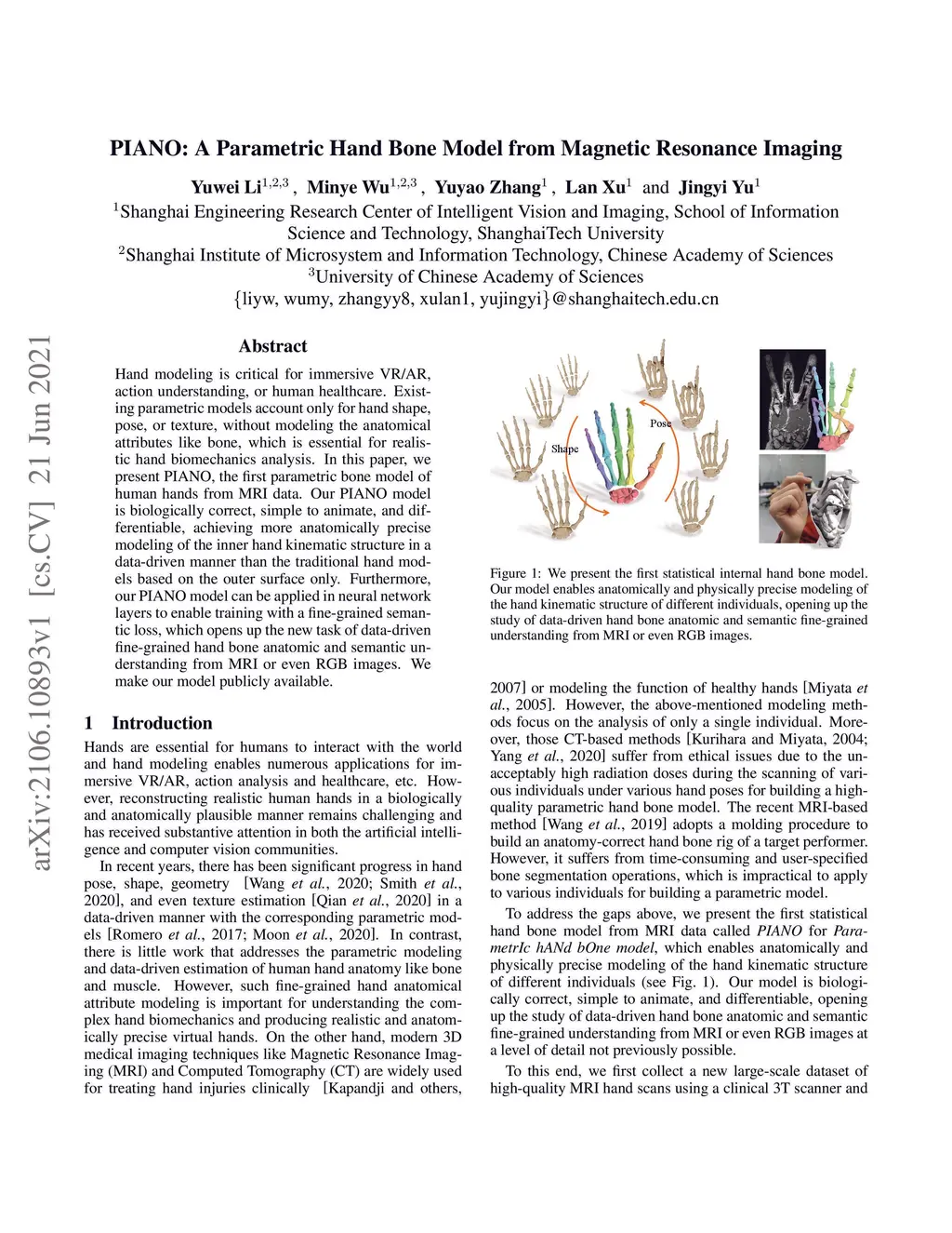 PIANO: A Parametric Hand Bone Model from Magnetic Resonance Imaging