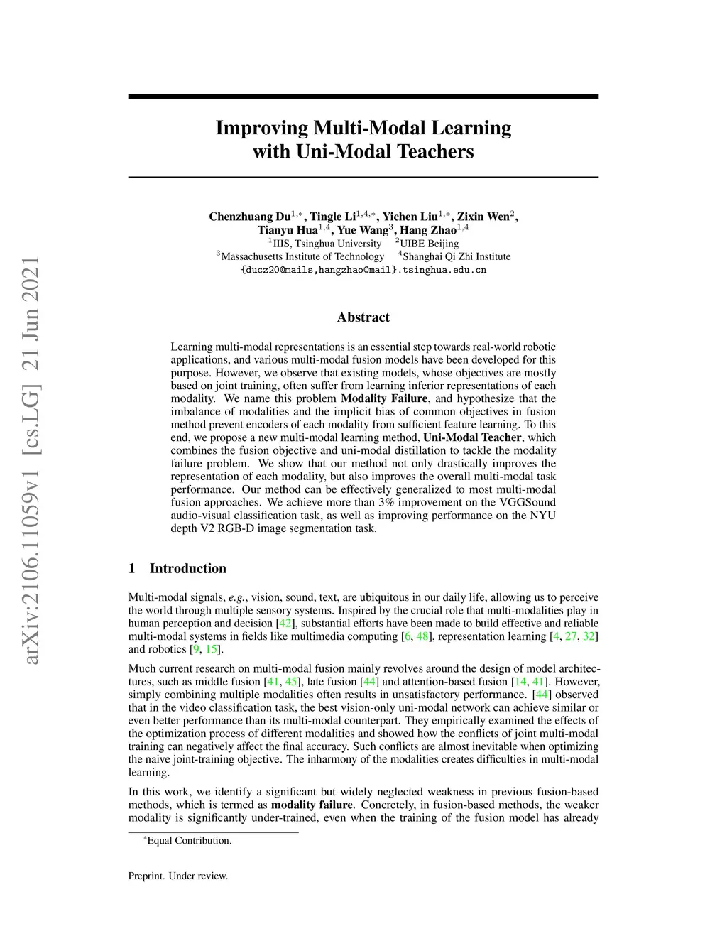 Learning multi-modal representations is an essential step towards real-world robotic applications, and various multi-modal fusion models have been developed for this purpose. However, we observe that existing models, whose objectives are mostly based on joint training, often suffer from learning inferior representations of each modality. We name this problem Modality Failure, and hypothesize that the imbalance of modalities and the implicit bias of common objectives in fusion method prevent encoders of each modality from sufficient feature learning. To this end, we propose a new multi-modal learning method, Uni-Modal Teacher, which combines the fusion objective and uni-modal distillation to tackle the modality failure problem. We show that our method not only drastically improves the representation of each modality, but also improves the overall multi-modal task performance. Our method can be effectively generalized to most multi-modal fusion approaches. We achieve more than 3% improvement on the VGGSound audio-visual classification task, as well as improving performance on the NYU depth V2 RGB-D image segmentation task.