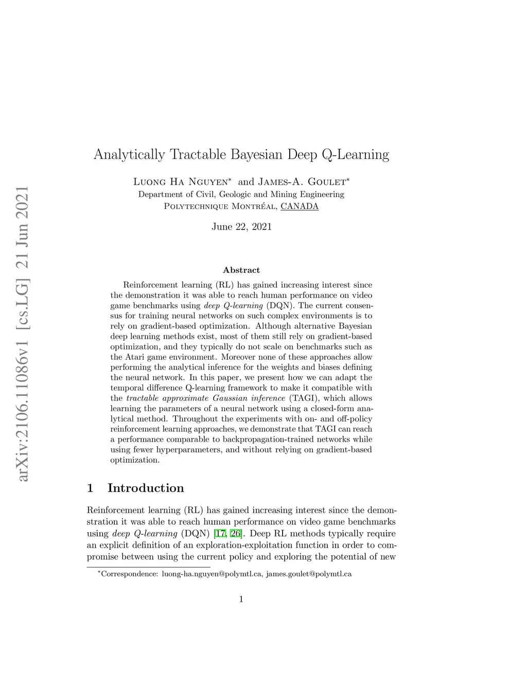 Reinforcement learning (RL) has gained increasing interest since the demonstration it was able to reach human performance on video game benchmarks using deep Q-learning (DQN). The current consensus for training neural networks on such complex environments is to rely on gradient-based optimization. Although alternative Bayesian deep learning methods exist, most of them still rely on gradient-based optimization, and they typically do not scale on benchmarks such as the Atari game environment. Moreover none of these approaches allow performing the analytical inference for the weights and biases defining the neural network. In this paper, we present how we can adapt the temporal difference Q-learning framework to make it compatible with the tractable approximate Gaussian inference (TAGI), which allows learning the parameters of a neural network using a closed-form analytical method. Throughout the experiments with on- and off-policy reinforcement learning approaches, we demonstrate that TAGI can reach a performance comparable to backpropagation-trained networks while using fewer hyperparameters, and without relying on gradient-based optimization.