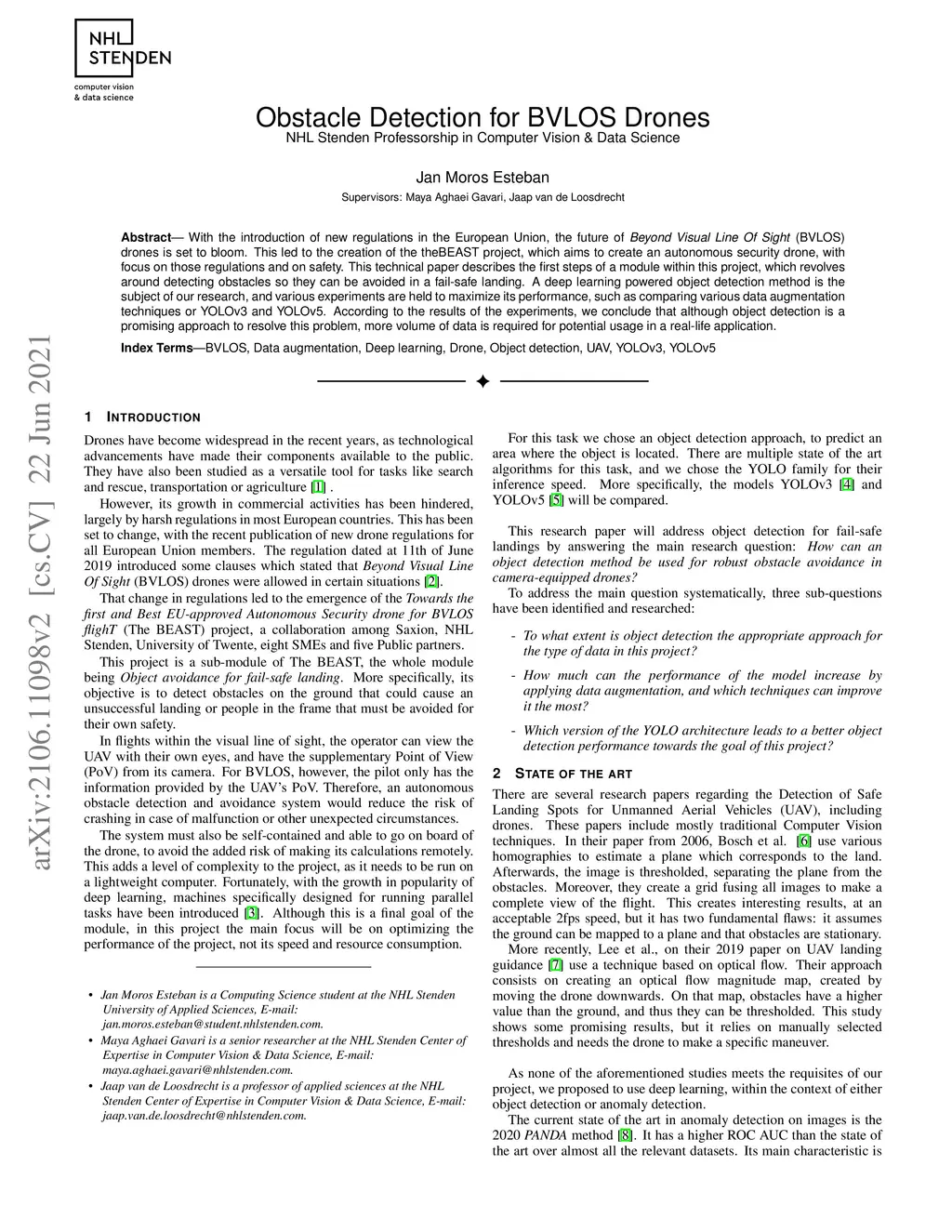With the introduction of new regulations in the European Union, the future of Beyond Visual Line Of Sight (BVLOS) drones is set to bloom. This led to the creation of the theBEAST project, which aims to create an autonomous security drone, with focus on those regulations and on safety. This technical paper describes the first steps of a module within this project, which revolves around detecting obstacles so they can be avoided in a fail-safe landing. A deep learning powered object detection method is the subject of our research, and various experiments are held to maximize its performance, such as comparing various data augmentation techniques or YOLOv3 and YOLOv5. According to the results of the experiments, we conclude that although object detection is a promising approach to resolve this problem, more volume of data is required for potential usage in a real-life application.