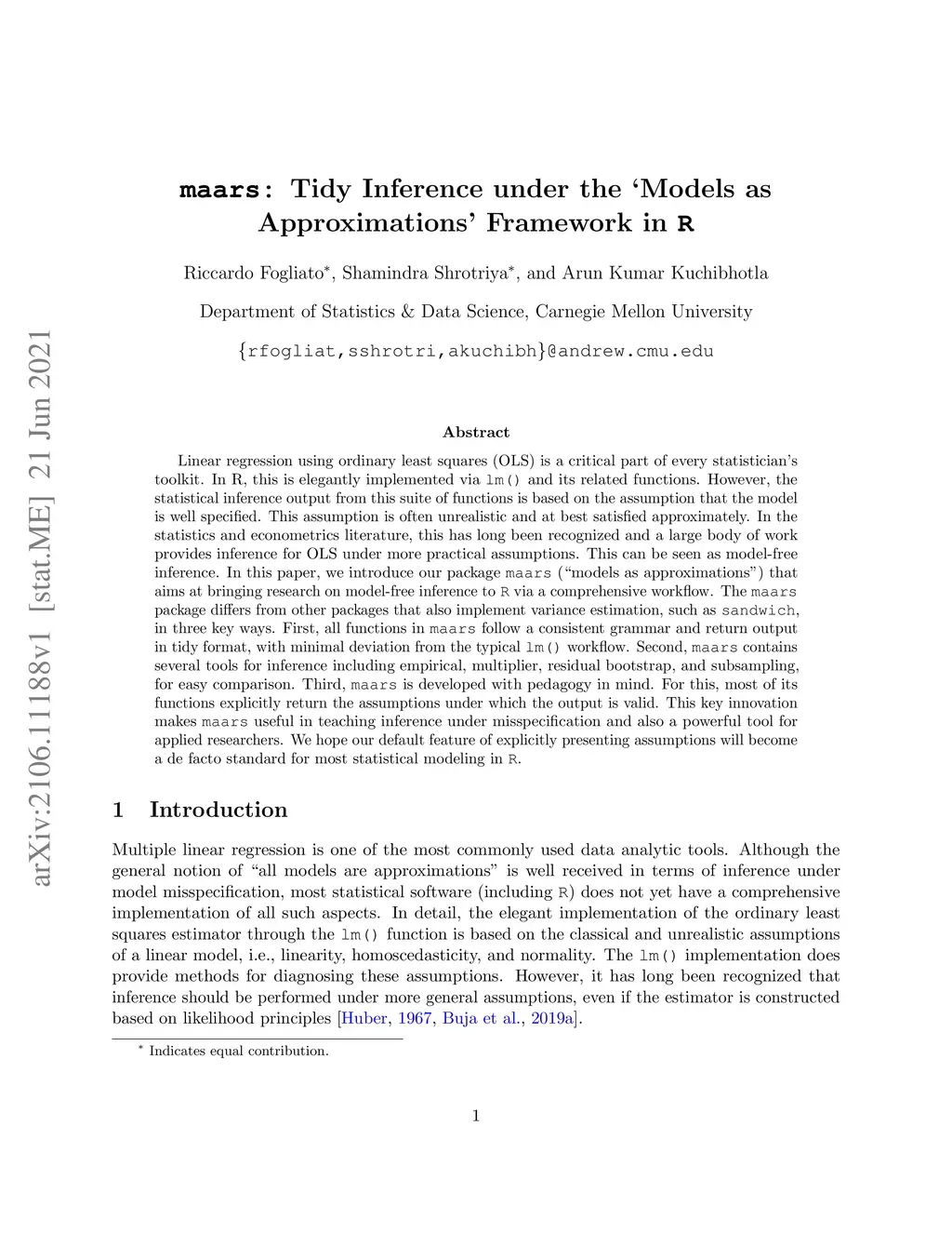 Linear regression using ordinary least squares (OLS) is a critical part of every statistician's toolkit. In R, this is elegantly implemented via lm() and its related functions. However, the statistical inference output from this suite of functions is based on the assumption that the model is well specified. This assumption is often unrealistic and at best satisfied approximately. In the statistics and econometrics literature, this has long been recognized and a large body of work provides inference for OLS under more practical assumptions. This can be seen as model-free inference. In this paper, we introduce our package maars ("models as approximations") that aims at bringing research on model-free inference to R via a comprehensive workflow. The maars package differs from other packages that also implement variance estimation, such as sandwich, in three key ways. First, all functions in maars follow a consistent grammar and return output in tidy format, with minimal deviation from the typical lm() workflow. Second, maars contains several tools for inference including empirical, multiplier, residual bootstrap, and subsampling, for easy comparison. Third, maars is developed with pedagogy in mind. For this, most of its functions explicitly return the assumptions under which the output is valid. This key innovation makes maars useful in teaching inference under misspecification and also a powerful tool for applied researchers. We hope our default feature of explicitly presenting assumptions will become a de facto standard for most statistical modeling in R.