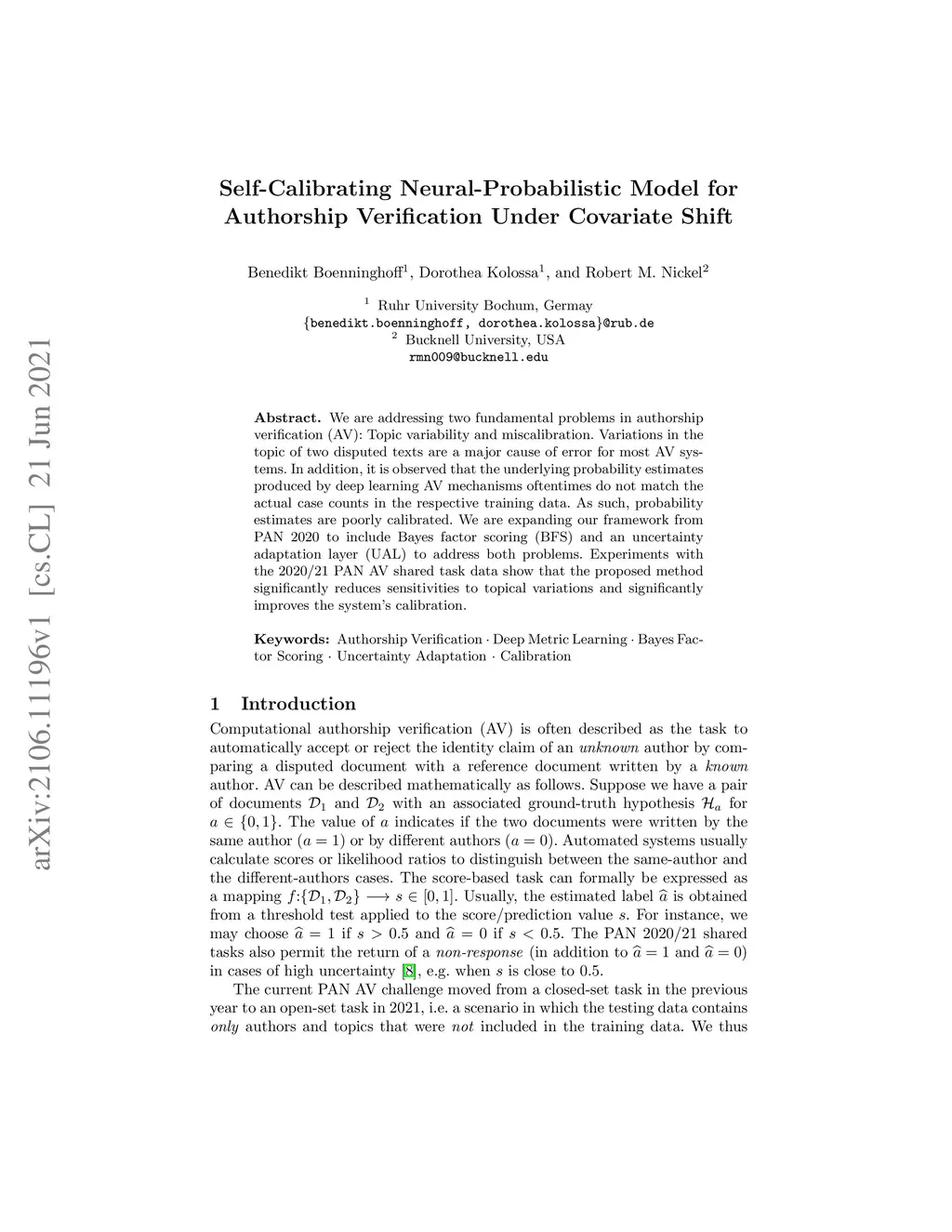 We are addressing two fundamental problems in authorship verification (AV): Topic variability and miscalibration. Variations in the topic of two disputed texts are a major cause of error for most AV systems. In addition, it is observed that the underlying probability estimates produced by deep learning AV mechanisms oftentimes do not match the actual case counts in the respective training data. As such, probability estimates are poorly calibrated. We are expanding our framework from PAN 2020 to include Bayes factor scoring (BFS) and an uncertainty adaptation layer (UAL) to address both problems. Experiments with the 2020/21 PAN AV shared task data show that the proposed method significantly reduces sensitivities to topical variations and significantly improves the system's calibration.