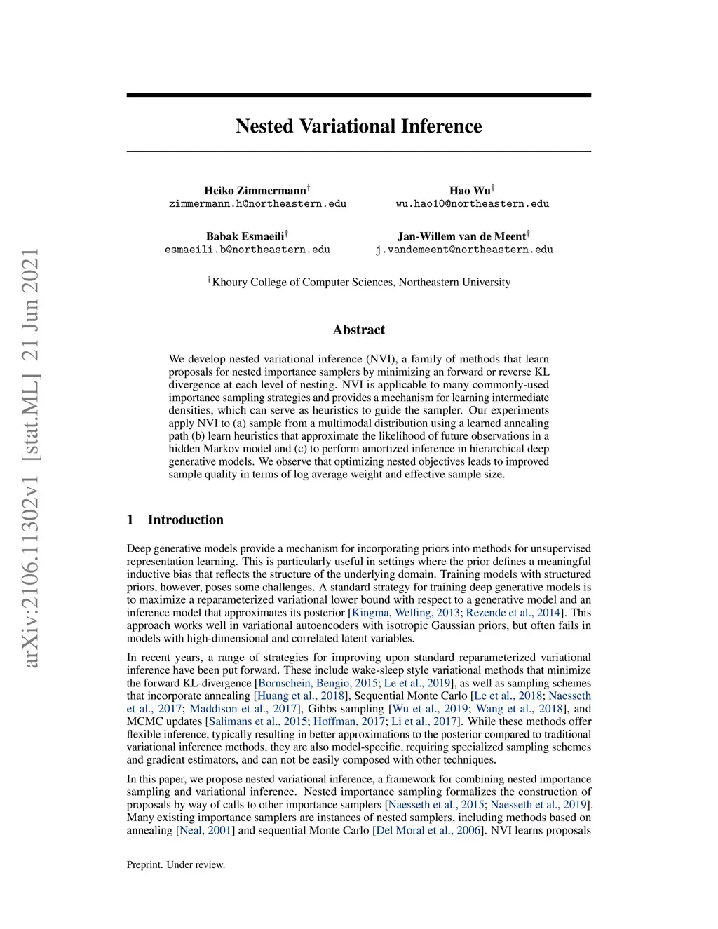 We develop nested variational inference (NVI), a family of methods that learn proposals for nested importance samplers by minimizing an forward or reverse KL divergence at each level of nesting. NVI is applicable to many commonly-used importance sampling strategies and provides a mechanism for learning intermediate densities, which can serve as heuristics to guide the sampler. Our experiments apply NVI to (a) sample from a multimodal distribution using a learned annealing path (b) learn heuristics that approximate the likelihood of future observations in a hidden Markov model and (c) to perform amortized inference in hierarchical deep generative models. We observe that optimizing nested objectives leads to improved sample quality in terms of log average weight and effective sample size.