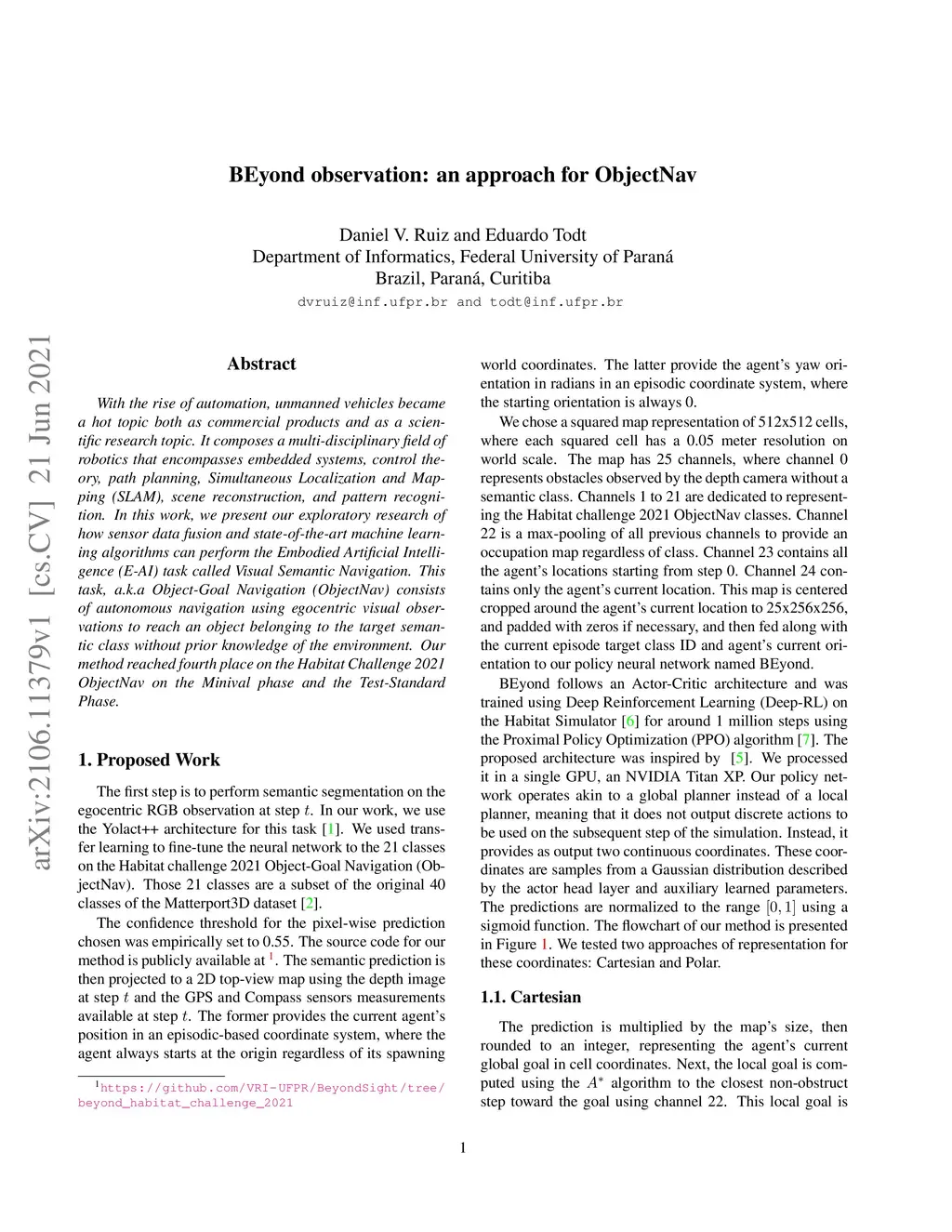 With the rise of automation, unmanned vehicles became a hot topic both as commercial products and as a scientific research topic. It composes a multi-disciplinary field of robotics that encompasses embedded systems, control theory, path planning, Simultaneous Localization and Mapping (SLAM), scene reconstruction, and pattern recognition. In this work, we present our exploratory research of how sensor data fusion and state-of-the-art machine learning algorithms can perform the Embodied Artificial Intelligence (E-AI) task called Visual Semantic Navigation. This task, a.k.a Object-Goal Navigation (ObjectNav) consists of autonomous navigation using egocentric visual observations to reach an object belonging to the target semantic class without prior knowledge of the environment. Our method reached fourth place on the Habitat Challenge 2021 ObjectNav on the Minival phase and the Test-Standard Phase.