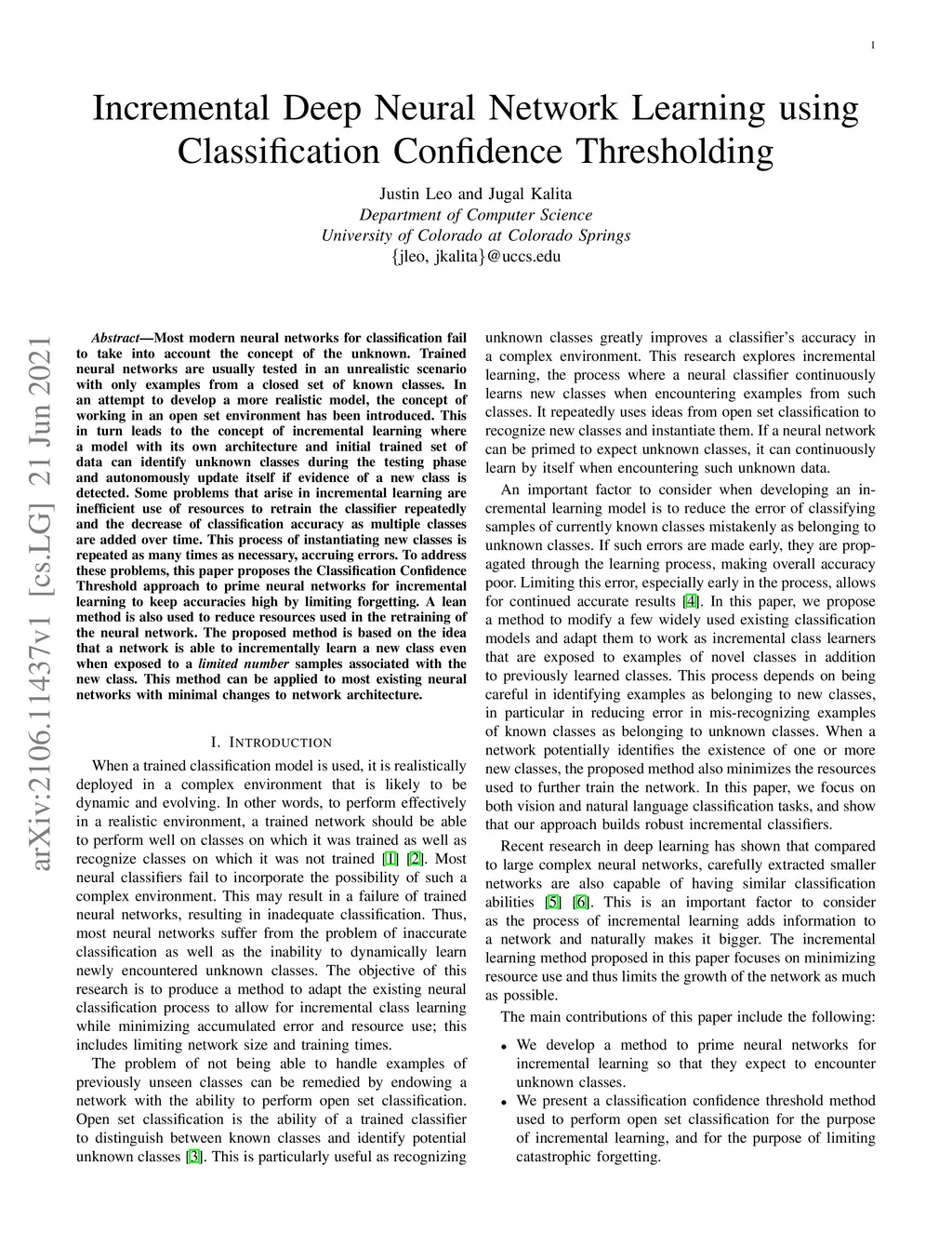 Most modern neural networks for classification fail to take into account the concept of the unknown. Trained neural networks are usually tested in an unrealistic scenario with only examples from a closed set of known classes. In an attempt to develop a more realistic model, the concept of working in an open set environment has been introduced. This in turn leads to the concept of incremental learning where a model with its own architecture and initial trained set of data can identify unknown classes during the testing phase and autonomously update itself if evidence of a new class is detected. Some problems that arise in incremental learning are inefficient use of resources to retrain the classifier repeatedly and the decrease of classification accuracy as multiple classes are added over time. This process of instantiating new classes is repeated as many times as necessary, accruing errors. To address these problems, this paper proposes the Classification Confidence Threshold approach to prime neural networks for incremental learning to keep accuracies high by limiting forgetting. A lean method is also used to reduce resources used in the retraining of the neural network. The proposed method is based on the idea that a network is able to incrementally learn a new class even when exposed to a limited number samples associated with the new class. This method can be applied to most existing neural networks with minimal changes to network architecture.