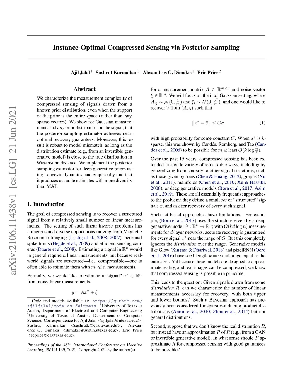 We characterize the measurement complexity of compressed sensing of signals drawn from a known prior distribution, even when the support of the prior is the entire space (rather than, say, sparse vectors). We show for Gaussian measurements and \emph{any} prior distribution on the signal, that the posterior sampling estimator achieves near-optimal recovery guarantees. Moreover, this result is robust to model mismatch, as long as the distribution estimate (e.g., from an invertible generative model) is close to the true distribution in Wasserstein distance. We implement the posterior sampling estimator for deep generative priors using Langevin dynamics, and empirically find that it produces accurate estimates with more diversity than MAP.