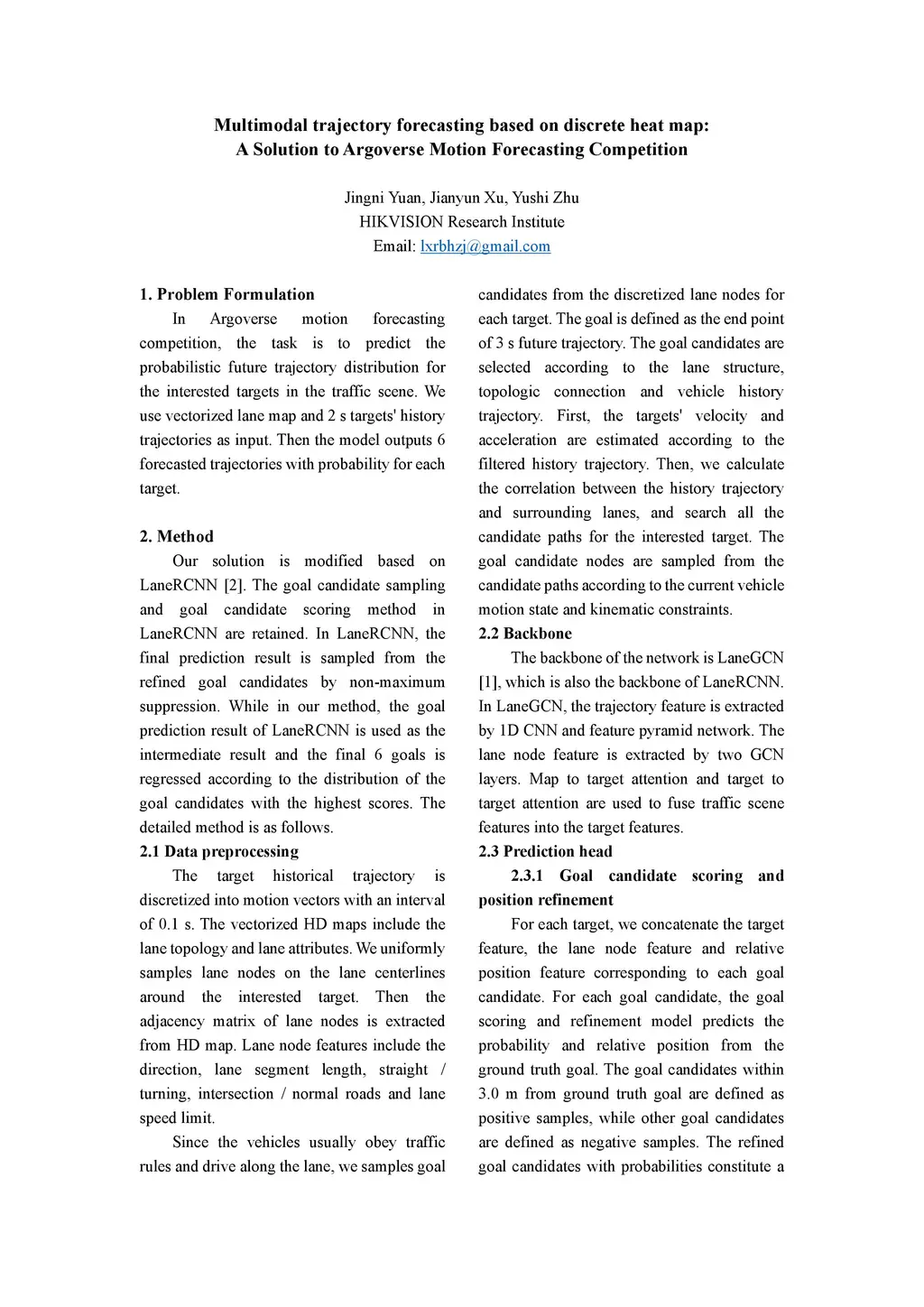 In Argoverse motion forecasting competition, the task is to predict the probabilistic future trajectory distribution for the interested targets in the traffic scene. We use vectorized lane map and 2 s targets' history trajectories as input. Then the model outputs 6 forecasted trajectories with probability for each target.