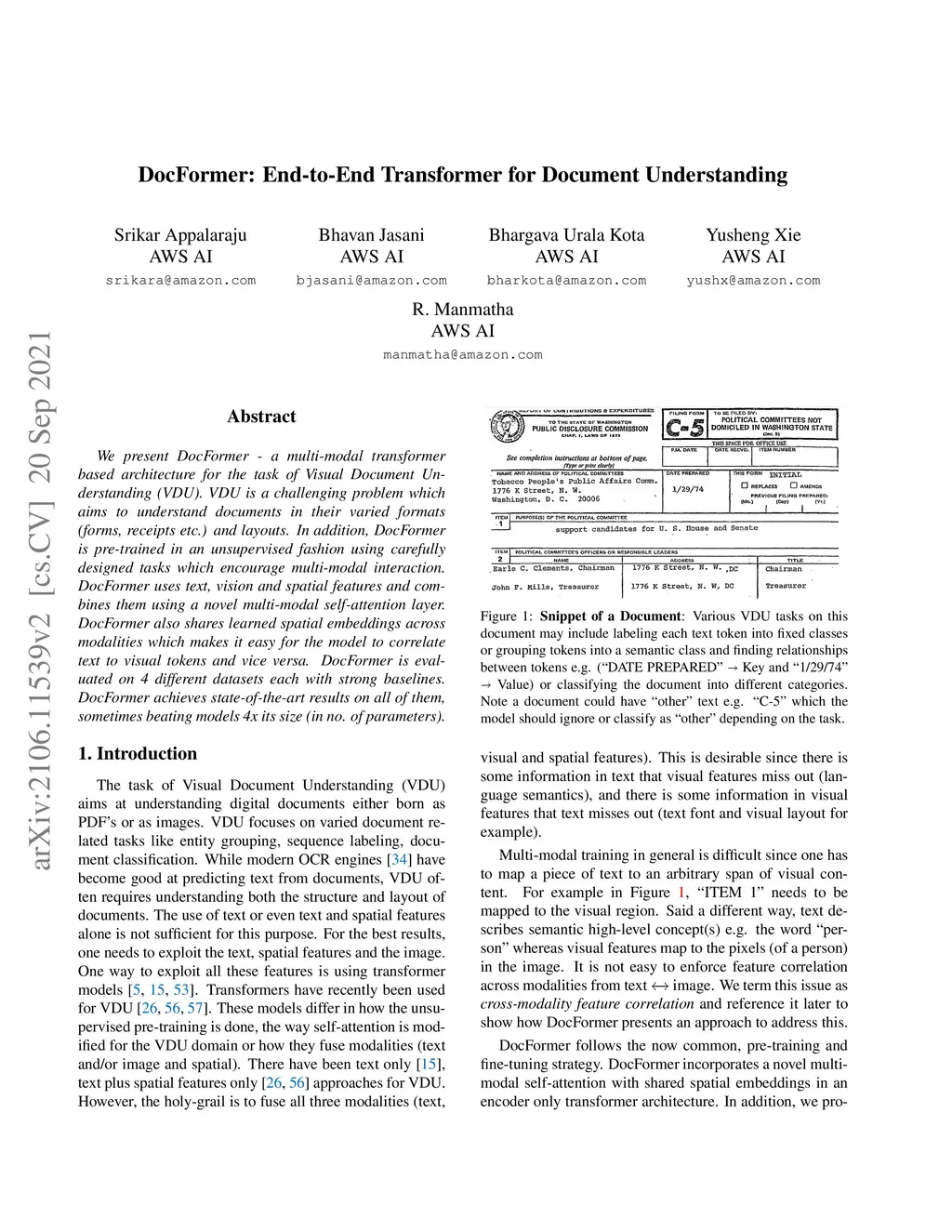We present DocFormer -- a multi-modal transformer based architecture for the task of Visual Document Understanding (VDU). VDU is a challenging problem which aims to understand documents in their varied formats (forms, receipts etc.) and layouts. In addition, DocFormer is pre-trained in an unsupervised fashion using carefully designed tasks which encourage multi-modal interaction. DocFormer uses text, vision and spatial features and combines them using a novel multi-modal self-attention layer. DocFormer also shares learned spatial embeddings across modalities which makes it easy for the model to correlate text to visual tokens and vice versa. DocFormer is evaluated on 4 different datasets each with strong baselines. DocFormer achieves state-of-the-art results on all of them, sometimes beating models 4x its size (in no. of parameters).