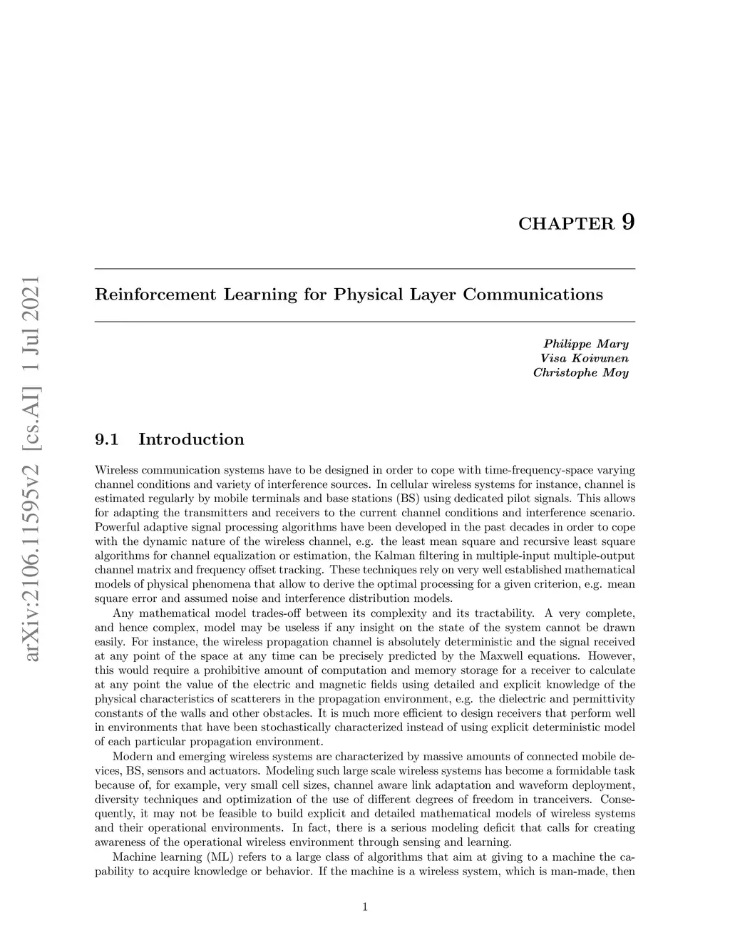 In this chapter, we will give comprehensive examples of applying RL in optimizing the physical layer of wireless communications by defining different class of problems and the possible solutions to handle them. In Section 9.2, we present all the basic theory needed to address a RL problem, i.e. Markov decision process (MDP), Partially observable Markov decision process (POMDP), but also two very important and widely used algorithms for RL, i.e. the Q-learning and SARSA algorithms. We also introduce the deep reinforcement learning (DRL) paradigm and the section ends with an introduction to the multi-armed bandits (MAB) framework. Section 9.3 focuses on some toy examples to illustrate how the basic concepts of RL are employed in communication systems. We present applications extracted from literature with simplified system models using similar notation as in Section 9.2 of this Chapter. In Section 9.3, we also focus on modeling RL problems, i.e. how action and state spaces and rewards are chosen. The Chapter is concluded in Section 9.4 with a prospective thought on RL trends and it ends with a review of a broader state of the art in Section 9.5.