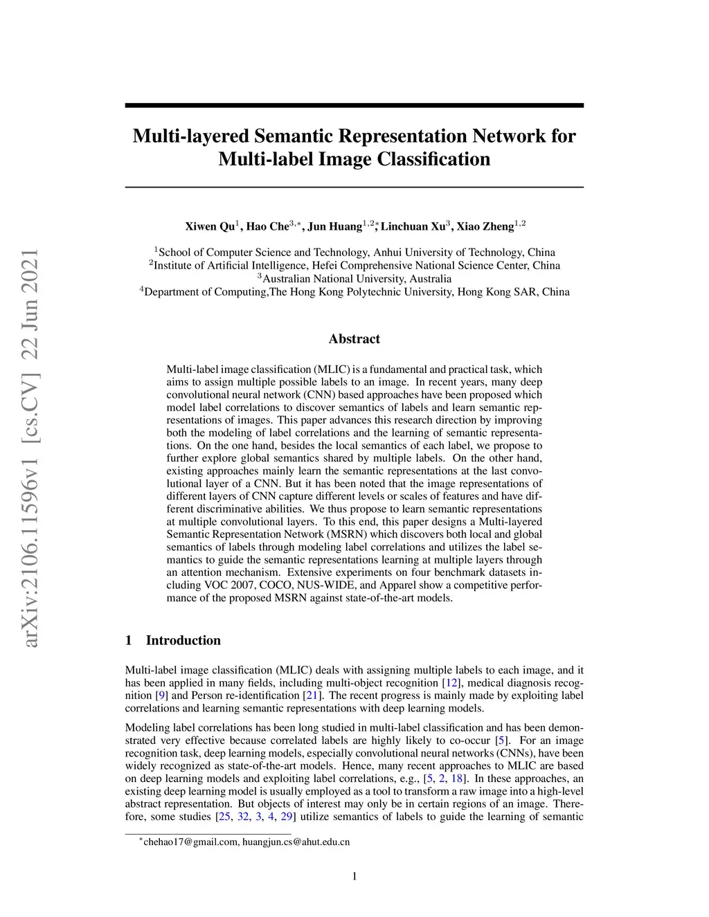 Multi-layered Semantic Representation Network for Multi-label Image