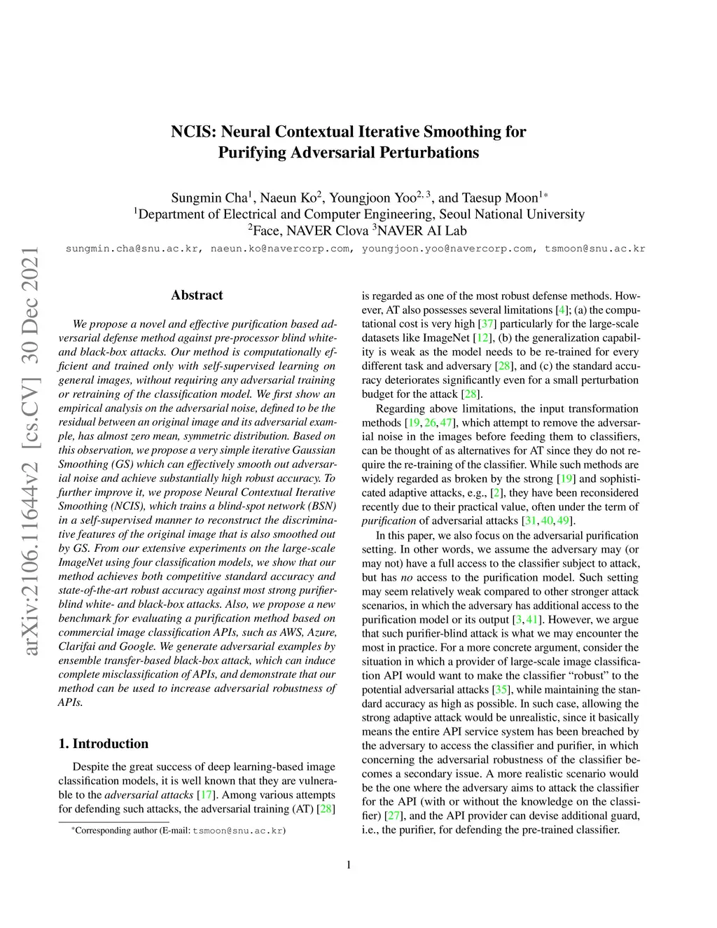 We propose a novel and effective purification based adversarial defense method against pre-processor blind white- and black-box attacks. Our method is computationally efficient and trained only with self-supervised learning on general images, without requiring any adversarial training or retraining of the classification model. We first show an empirical analysis on the adversarial noise, defined to be the residual between an original image and its adversarial example, has almost zero mean, symmetric distribution. Based on this observation, we propose a very simple iterative Gaussian Smoothing (GS) which can effectively smooth out adversarial noise and achieve substantially high robust accuracy. To further improve it, we propose Neural Contextual Iterative Smoothing (NCIS), which trains a blind-spot network (BSN) in a self-supervised manner to reconstruct the discriminative features of the original image that is also smoothed out by GS. From our extensive experiments on the large-scale ImageNet using four classification models, we show that our method achieves both competitive standard accuracy and state-of-the-art robust accuracy against most strong purifier-blind white- and black-box attacks. Also, we propose a new benchmark for evaluating a purification method based on commercial image classification APIs, such as AWS, Azure, Clarifai and Google. We generate adversarial examples by ensemble transfer-based black-box attack, which can induce complete misclassification of APIs, and demonstrate that our method can be used to increase adversarial robustness of APIs.