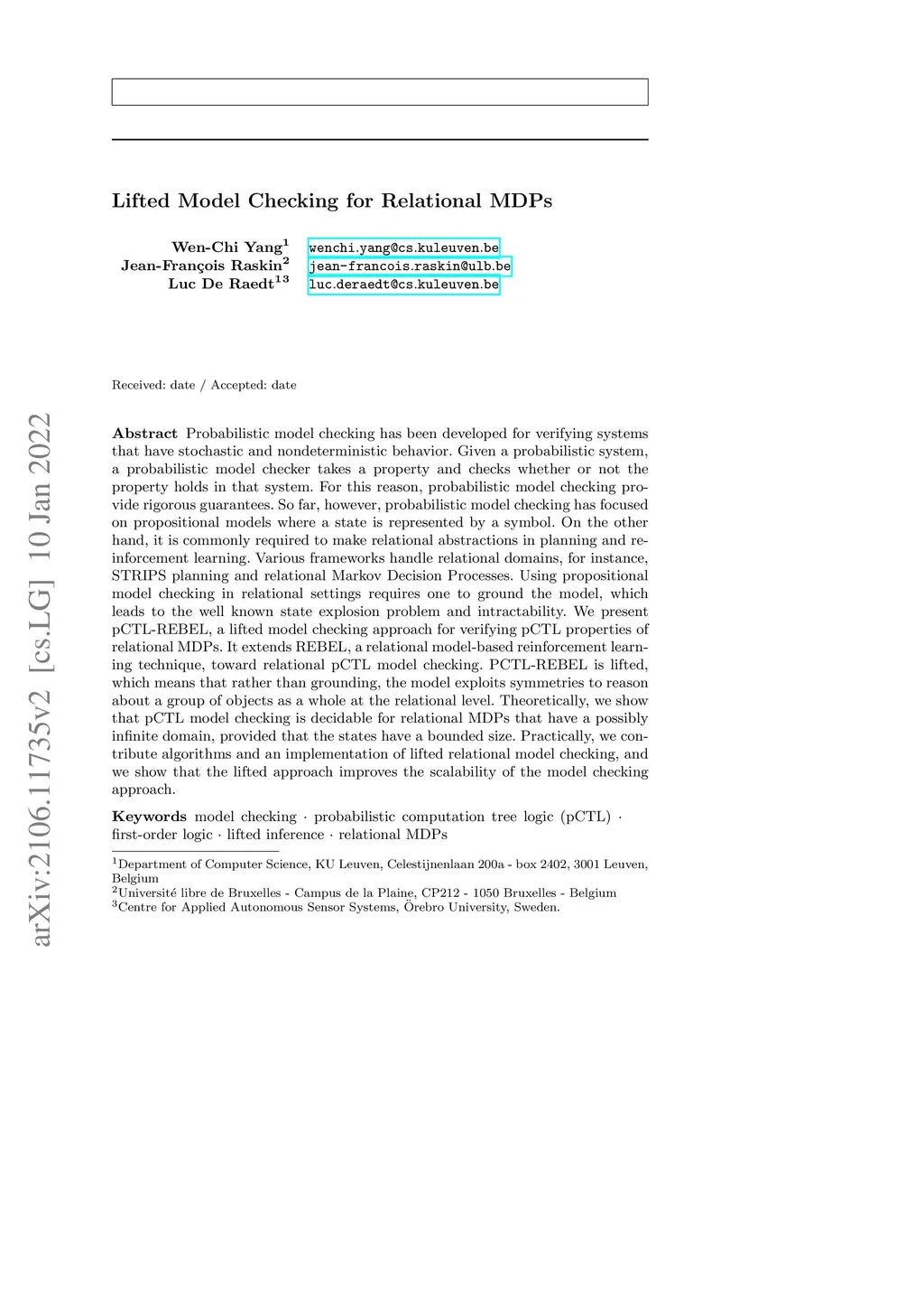 Probabilistic model checking has been developed for verifying systems that have stochastic and nondeterministic behavior. Given a probabilistic system, a probabilistic model checker takes a property and checks whether or not the property holds in that system. For this reason, probabilistic model checking provide rigorous guarantees. So far, however, probabilistic model checking has focused on propositional models where a state is represented by a symbol. On the other hand, it is commonly required to make relational abstractions in planning and reinforcement learning. Various frameworks handle relational domains, for instance, STRIPS planning and relational Markov Decision Processes. Using propositional model checking in relational settings requires one to ground the model, which leads to the well known state explosion problem and intractability. We present pCTL-REBEL, a lifted model checking approach for verifying pCTL properties of relational MDPs. It extends REBEL, a relational model-based reinforcement learning technique, toward relational pCTL model checking. PCTL-REBEL is lifted, which means that rather than grounding, the model exploits symmetries to reason about a group of objects as a whole at the relational level. Theoretically, we show that pCTL model checking is decidable for relational MDPs that have a possibly infinite domain, provided that the states have a bounded size. Practically, we contribute algorithms and an implementation of lifted relational model checking, and we show that the lifted approach improves the scalability of the model checking approach.