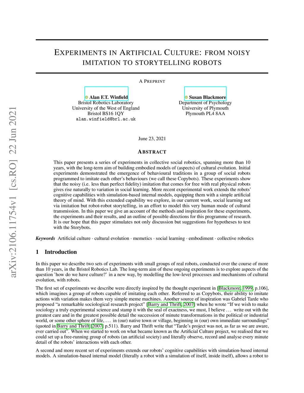 This paper presents a series of experiments in collective social robotics, spanning more than 10 years, with the long-term aim of building embodied models of (aspects) of cultural evolution. Initial experiments demonstrated the emergence of behavioural traditions in a group of social robots programmed to imitate each other's behaviours (we call these Copybots). These experiments show that the noisy (i.e. less than perfect fidelity) imitation that comes for free with real physical robots gives rise naturally to variation in social learning. More recent experimental work extends the robots' cognitive capabilities with simulation-based internal models, equipping them with a simple artificial theory of mind. With this extended capability we explore, in our current work, social learning not via imitation but robot-robot storytelling, in an effort to model this very human mode of cultural transmission. In this paper we give an account of the methods and inspiration for these experiments, the experiments and their results, and an outline of possible directions for this programme of research. It is our hope that this paper stimulates not only discussion but suggestions for hypotheses to test with the Storybots.