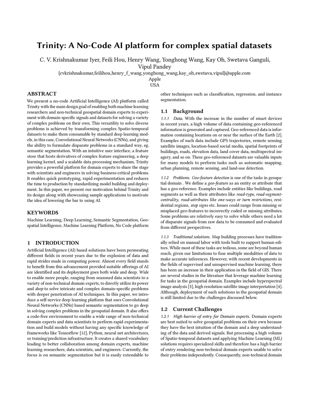We present a no-code Artificial Intelligence (AI) platform called Trinity with the main design goal of enabling both machine learning researchers and non-technical geospatial domain experts to experiment with domain-specific signals and datasets for solving a variety of complex problems on their own. This versatility to solve diverse problems is achieved by transforming complex Spatio-temporal datasets to make them consumable by standard deep learning models, in this case, Convolutional Neural Networks (CNNs), and giving the ability to formulate disparate problems in a standard way, eg. semantic segmentation. With an intuitive user interface, a feature store that hosts derivatives of complex feature engineering, a deep learning kernel, and a scalable data processing mechanism, Trinity provides a powerful platform for domain experts to share the stage with scientists and engineers in solving business-critical problems. It enables quick prototyping, rapid experimentation and reduces the time to production by standardizing model building and deployment. In this paper, we present our motivation behind Trinity and its design along with showcasing sample applications to motivate the idea of lowering the bar to using AI.