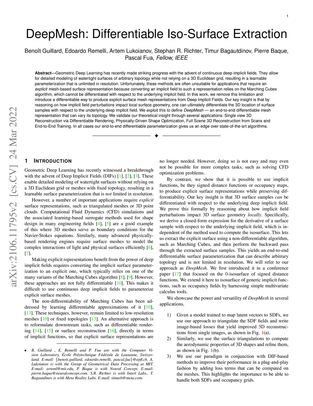 Geometric Deep Learning has recently made striking progress with the advent of continuous deep implicit fields. They allow for detailed modeling of watertight surfaces of arbitrary topology while not relying on a 3D Euclidean grid, resulting in a learnable parameterization that is unlimited in resolution. Unfortunately, these methods are often unsuitable for applications that require an explicit mesh-based surface representation because converting an implicit field to such a representation relies on the Marching Cubes algorithm, which cannot be differentiated with respect to the underlying implicit field. In this work, we remove this limitation and introduce a differentiable way to produce explicit surface mesh representations from Deep Implicit Fields. Our key insight is that by reasoning on how implicit field perturbations impact local surface geometry, one can ultimately differentiate the 3D location of surface samples with respect to the underlying deep implicit field. We exploit this to define DeepMesh - an end-to-end differentiable mesh representation that can vary its topology. We validate our theoretical insight through several applications: Single view 3D Reconstruction via Differentiable Rendering, Physically-Driven Shape Optimization, Full Scene 3D Reconstruction from Scans and End-to-End Training. In all cases our end-to-end differentiable parameterization gives us an edge over state-of-the-art algorithms.