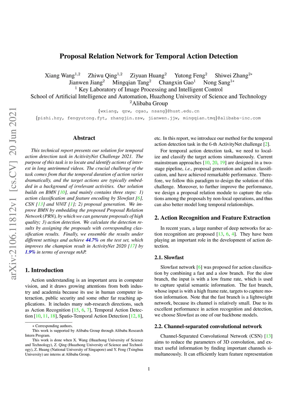 This technical report presents our solution for temporal action detection task in AcitivityNet Challenge 2021. The purpose of this task is to locate and identify actions of interest in long untrimmed videos. The crucial challenge of the task comes from that the temporal duration of action varies dramatically, and the target actions are typically embedded in a background of irrelevant activities. Our solution builds on BMN, and mainly contains three steps: 1) action classification and feature encoding by Slowfast, CSN and ViViT; 2) proposal generation. We improve BMN by embedding the proposed Proposal Relation Network (PRN), by which we can generate proposals of high quality; 3) action detection. We calculate the detection results by assigning the proposals with corresponding classification results. Finally, we ensemble the results under different settings and achieve 44.7% on the test set, which improves the champion result in ActivityNet 2020 by 1.9% in terms of average mAP.