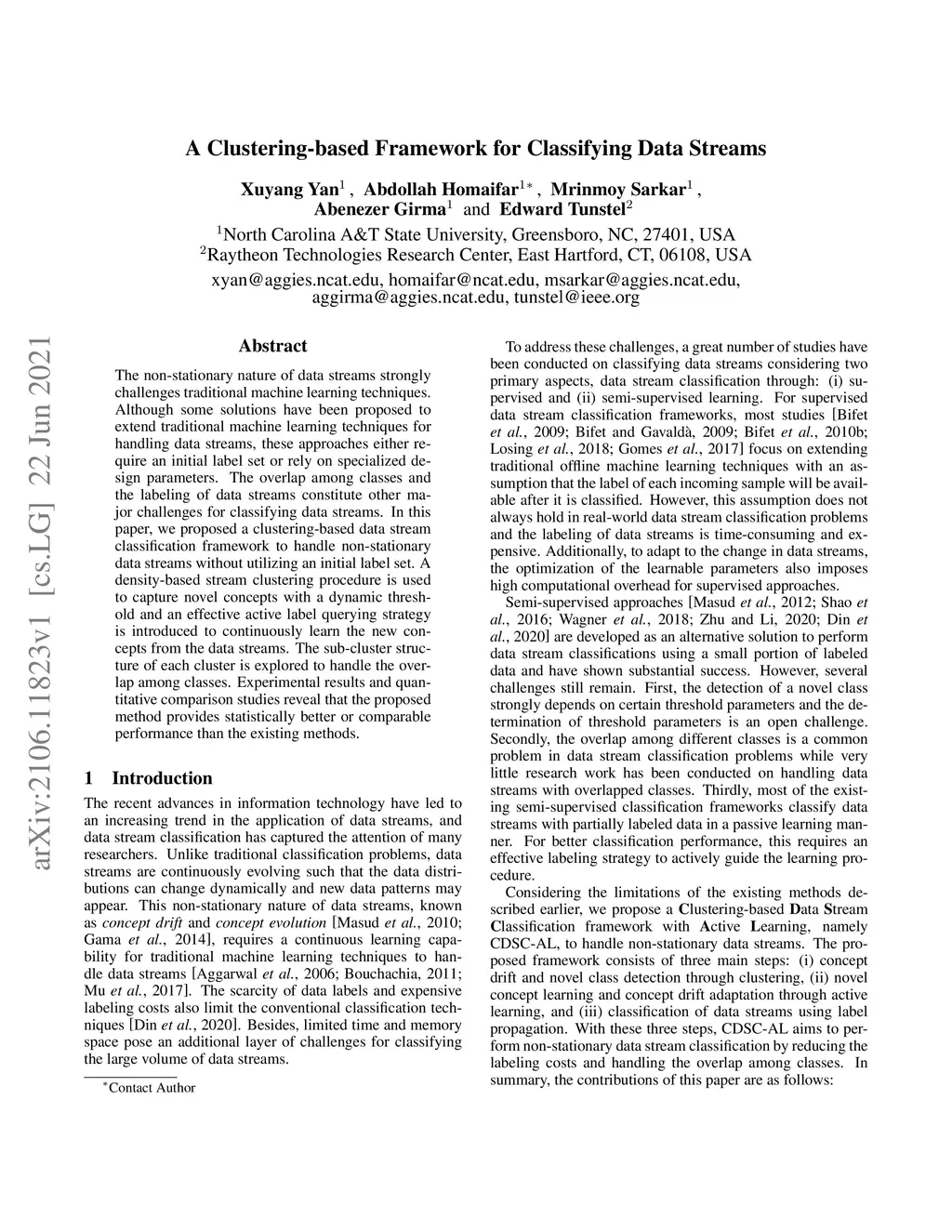 The non-stationary nature of data streams strongly challenges traditional machine learning techniques. Although some solutions have been proposed to extend traditional machine learning techniques for handling data streams, these approaches either require an initial label set or rely on specialized design parameters. The overlap among classes and the labeling of data streams constitute other major challenges for classifying data streams. In this paper, we proposed a clustering-based data stream classification framework to handle non-stationary data streams without utilizing an initial label set. A density-based stream clustering procedure is used to capture novel concepts with a dynamic threshold and an effective active label querying strategy is introduced to continuously learn the new concepts from the data streams. The sub-cluster structure of each cluster is explored to handle the overlap among classes. Experimental results and quantitative comparison studies reveal that the proposed method provides statistically better or comparable performance than the existing methods.