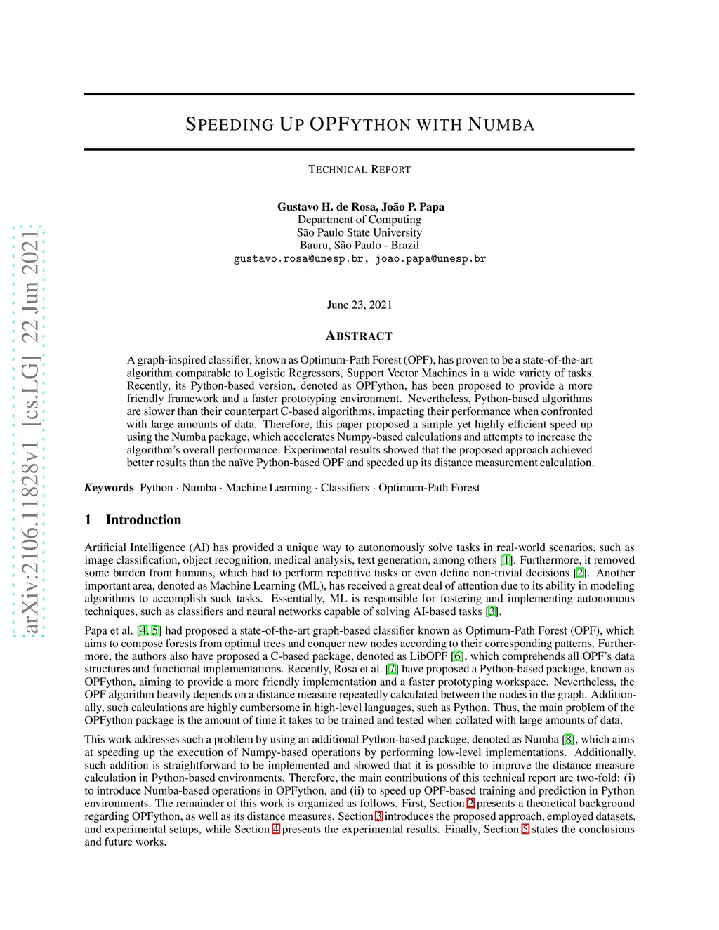 A graph-inspired classifier, known as Optimum-Path Forest (OPF), has proven to be a state-of-the-art algorithm comparable to Logistic Regressors, Support Vector Machines in a wide variety of tasks. Recently, its Python-based version, denoted as OPFython, has been proposed to provide a more friendly framework and a faster prototyping environment. Nevertheless, Python-based algorithms are slower than their counterpart C-based algorithms, impacting their performance when confronted with large amounts of data. Therefore, this paper proposed a simple yet highly efficient speed up using the Numba package, which accelerates Numpy-based calculations and attempts to increase the algorithm's overall performance. Experimental results showed that the proposed approach achieved better results than the na\"ive Python-based OPF and speeded up its distance measurement calculation.
