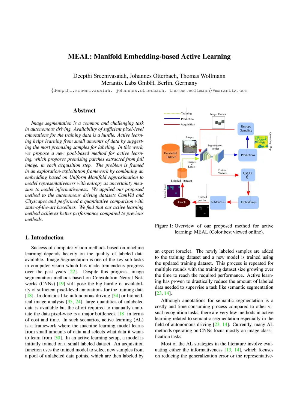 Image segmentation is a common and challenging task in autonomous driving. Availability of sufficient pixel-level annotations for the training data is a hurdle. Active learning helps learning from small amounts of data by suggesting the most promising samples for labeling. In this work, we propose a new pool-based method for active learning, which proposes promising patches extracted from full image, in each acquisition step. The problem is framed in an exploration-exploitation framework by combining an embedding based on Uniform Manifold Approximation to model representativeness with entropy as uncertainty measure to model informativeness. We applied our proposed method to the autonomous driving datasets CamVid and Cityscapes and performed a quantitative comparison with state-of-the-art baselines. We find that our active learning method achieves better performance compared to previous methods.