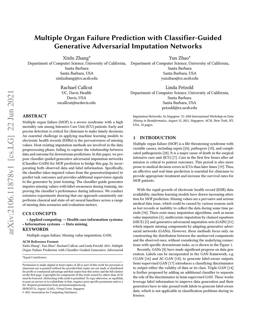 Multiple organ failure (MOF) is a severe syndrome with a high mortality rate among Intensive Care Unit (ICU) patients. Early and precise detection is critical for clinicians to make timely decisions. An essential challenge in applying machine learning models to electronic health records (EHRs) is the pervasiveness of missing values. Most existing imputation methods are involved in the data preprocessing phase, failing to capture the relationship between data and outcome for downstream predictions. In this paper, we propose classifier-guided generative adversarial imputation networks Classifier-GAIN) for MOF prediction to bridge this gap, by incorporating both observed data and label information. Specifically, the classifier takes imputed values from the generator(imputer) to predict task outcomes and provides additional supervision signals to the generator by joint training. The classifier-guide generator imputes missing values with label-awareness during training, improving the classifier's performance during inference. We conduct extensive experiments showing that our approach consistently outperforms classical and state-of-art neural baselines across a range of missing data scenarios and evaluation metrics.