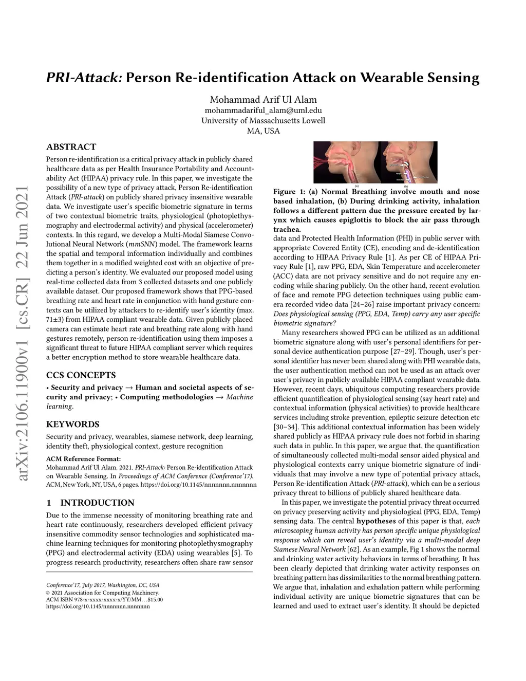 Person re-identification is a critical privacy attack in publicly shared healthcare data as per Health Insurance Portability and Accountability Act (HIPAA) privacy rule. In this paper, we investigate the possibility of a new type of privacy attack, Person Re-identification Attack (PRI-attack) on publicly shared privacy insensitive wearable data. We investigate user's specific biometric signature in terms of two contextual biometric traits, physiological (photoplethysmography and electrodermal activity) and physical (accelerometer) contexts. In this regard, we develop a Multi-Modal Siamese Convolutional Neural Network (mmSNN) model. The framework learns the spatial and temporal information individually and combines them together in a modified weighted cost with an objective of predicting a person's identity. We evaluated our proposed model using real-time collected data from 3 collected datasets and one publicly available dataset. Our proposed framework shows that PPG-based breathing rate and heart rate in conjunction with hand gesture contexts can be utilized by attackers to re-identify user's identity (max. 71%) from HIPAA compliant wearable data. Given publicly placed camera can estimate heart rate and breathing rate along with hand gestures remotely, person re-identification using them imposes a significant threat to future HIPAA compliant server which requires a better encryption method to store wearable healthcare data.