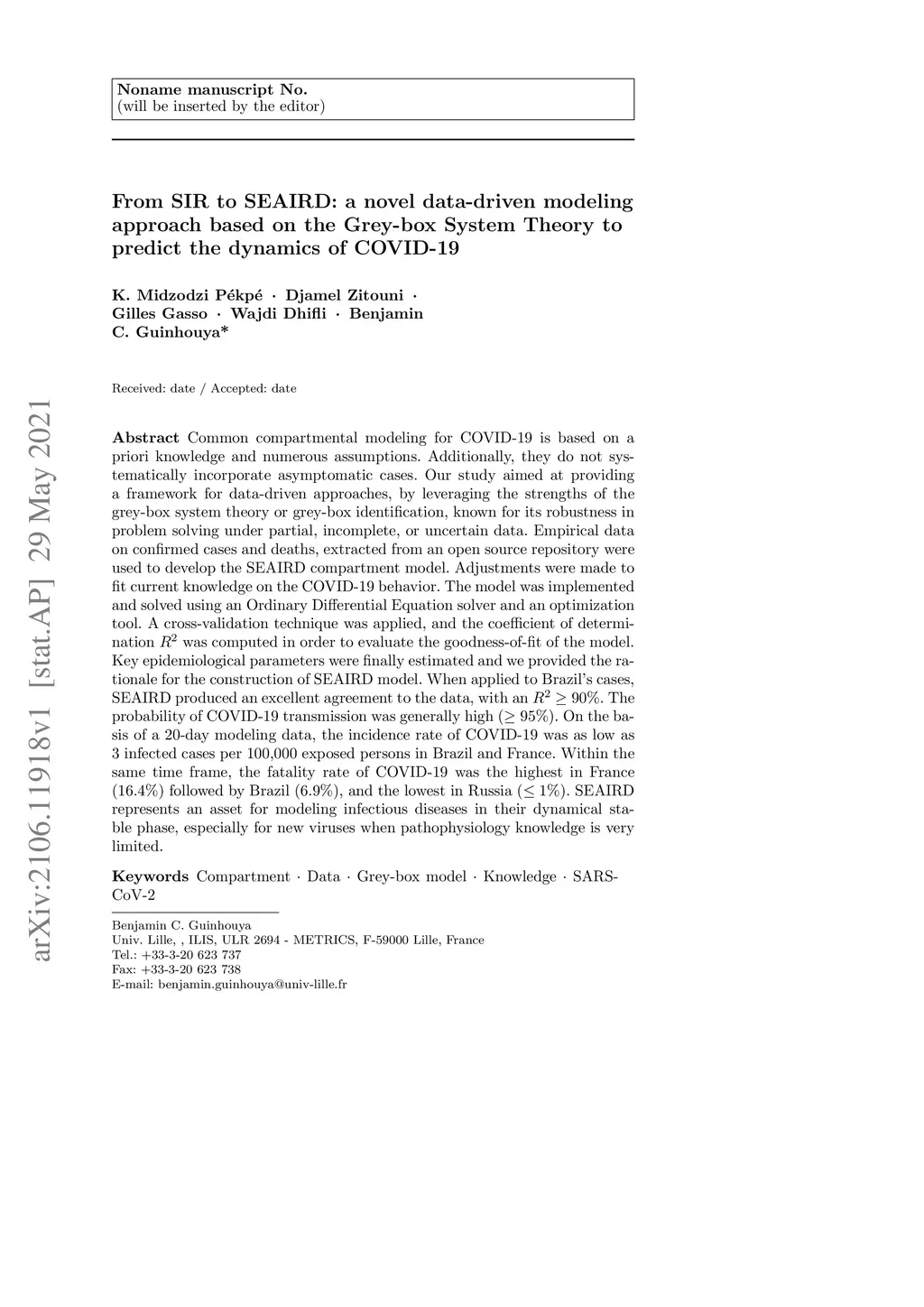 Common compartmental modeling for COVID-19 is based on a priori knowledge and numerous assumptions. Additionally, they do not systematically incorporate asymptomatic cases. Our study aimed at providing a framework for data-driven approaches, by leveraging the strengths of the grey-box system theory or grey-box identification, known for its robustness in problem solving under partial, incomplete, or uncertain data. Empirical data on confirmed cases and deaths, extracted from an open source repository were used to develop the SEAIRD compartment model. Adjustments were made to fit current knowledge on the COVID-19 behavior. The model was implemented and solved using an Ordinary Differential Equation solver and an optimization tool. A cross-validation technique was applied, and the coefficient of determination was computed in order to evaluate the goodness-of-fit of the model. %to the data. Key epidemiological parameters were finally estimated and we provided the rationale for the construction of SEAIRD model. When applied to Brazil's cases, SEAIRD produced an excellent agreement to the data, with an %coefficient of determination . The probability of COVID-19 transmission was generally high (). On the basis of a 20-day modeling data, the incidence rate of COVID-19 was as low as 3 infected cases per 100,000 exposed persons in Brazil and France. Within the same time frame, the fatality rate of COVID-19 was the highest in France (16.4\%) followed by Brazil (6.9\%), and the lowest in Russia (). SEAIRD represents an asset for modeling infectious diseases in their dynamical stable phase, especially for new viruses when pathophysiology knowledge is very limited.