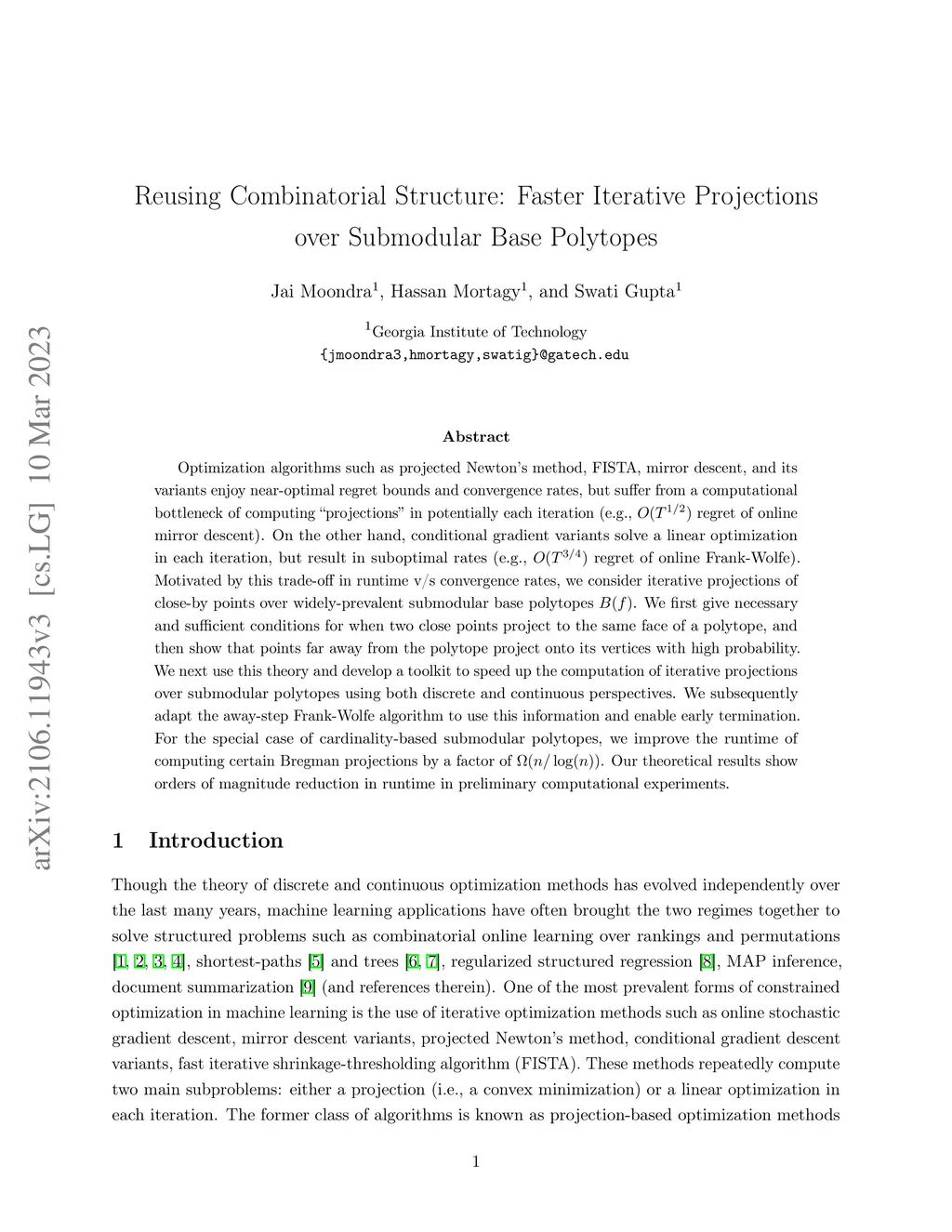 Optimization algorithms such as projected Newton's method, FISTA, mirror descent, and its variants enjoy near-optimal regret bounds and convergence rates, but suffer from a computational bottleneck of computing ``projections'' in potentially each iteration (e.g., regret of online mirror descent). On the other hand, conditional gradient variants solve a linear optimization in each iteration, but result in suboptimal rates (e.g., regret of online Frank-Wolfe). Motivated by this trade-off in runtime v/s convergence rates, we consider iterative projections of close-by points over widely-prevalent submodular base polytopes . We first give necessary and sufficient conditions for when two close points project to the same face of a polytope, and then show that points far away from the polytope project onto its vertices with high probability. We next use this theory and develop a toolkit to speed up the computation of iterative projections over submodular polytopes using both discrete and continuous perspectives. We subsequently adapt the away-step Frank-Wolfe algorithm to use this information and enable early termination. For the special case of cardinality-based submodular polytopes, we improve the runtime of computing certain Bregman projections by a factor of . Our theoretical results show orders of magnitude reduction in runtime in preliminary computational experiments.