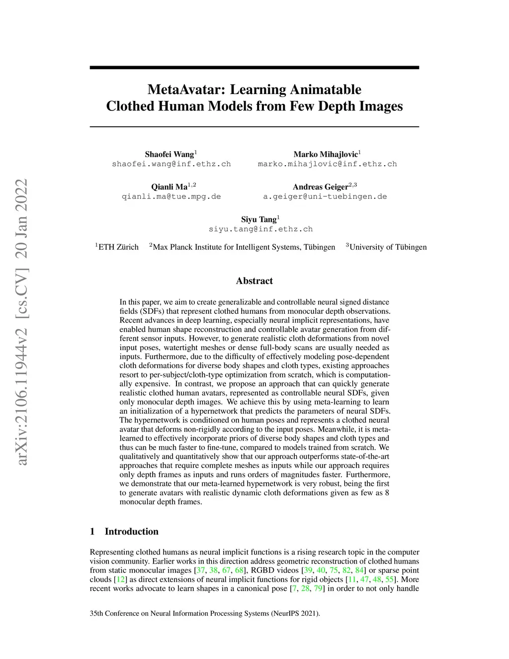MetaAvatar: Learning Animatable Clothed Human Models from Few Depth